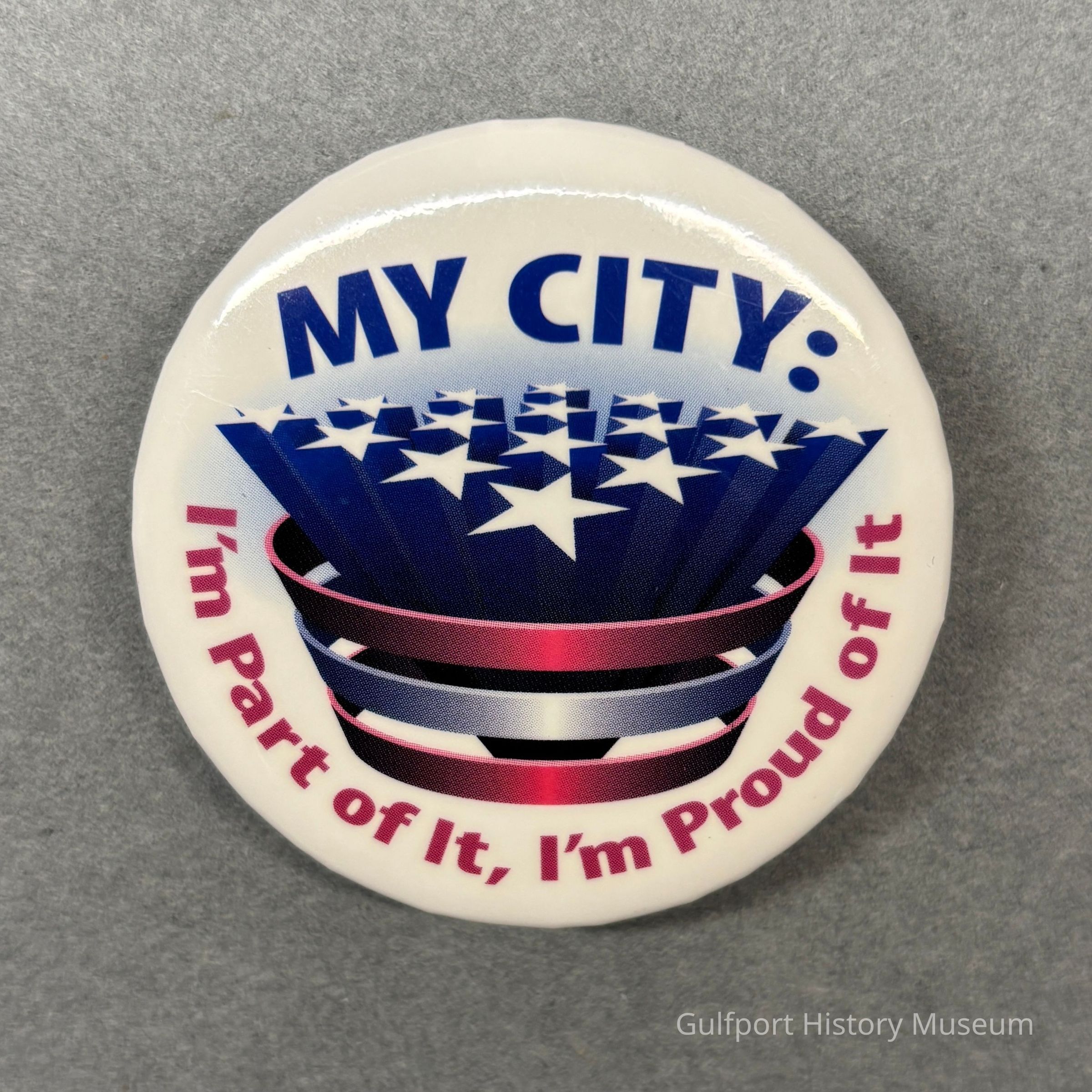 A political button badge with a star and stripes design.Acquisition