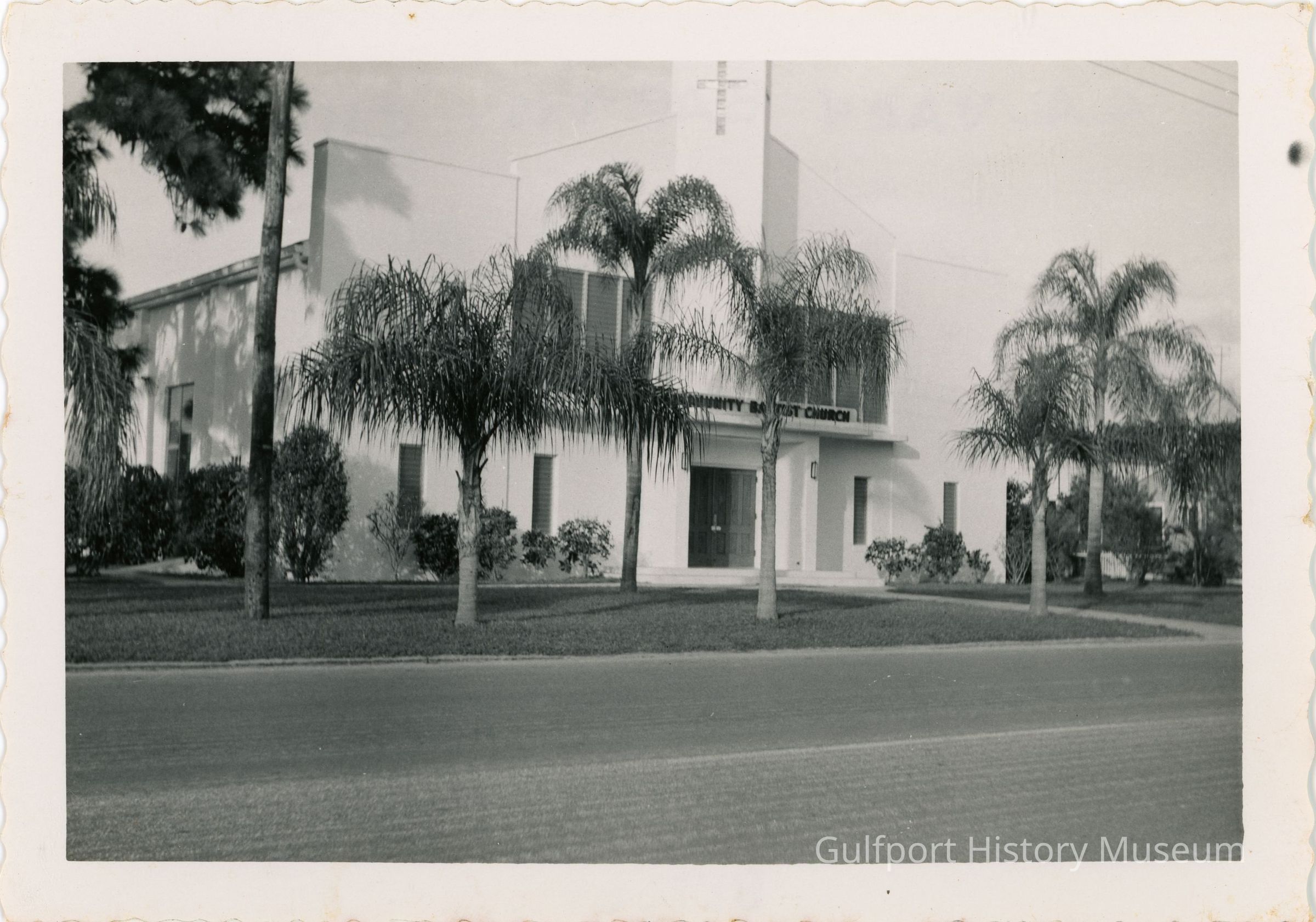 A black and white photograph of Calvary Baptist Church from the road. The church is a two story white building. The words "COMMUNITY BAPTIST CHURCH" can be seen above the main entrance. A small steeple (?) on the front of the building features two crosses made of glass blocks (?). The lawn is landscaped and has several palm trees.
