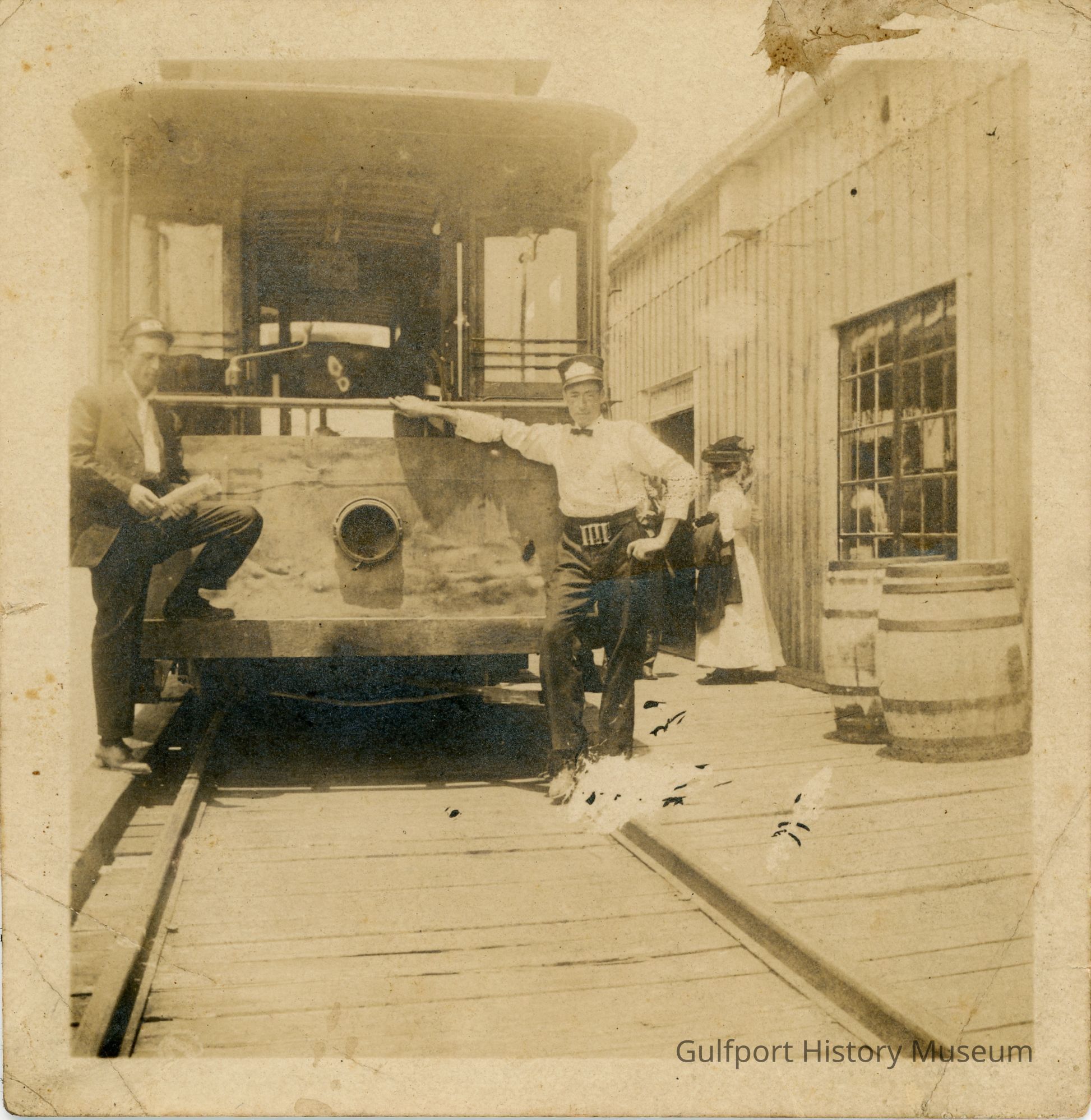 A black and white photograph of two men, streetcar conductors, standing in front of a trolley at a station. A woman in a light colored dress is standing on the platform behind them.Photograph Details