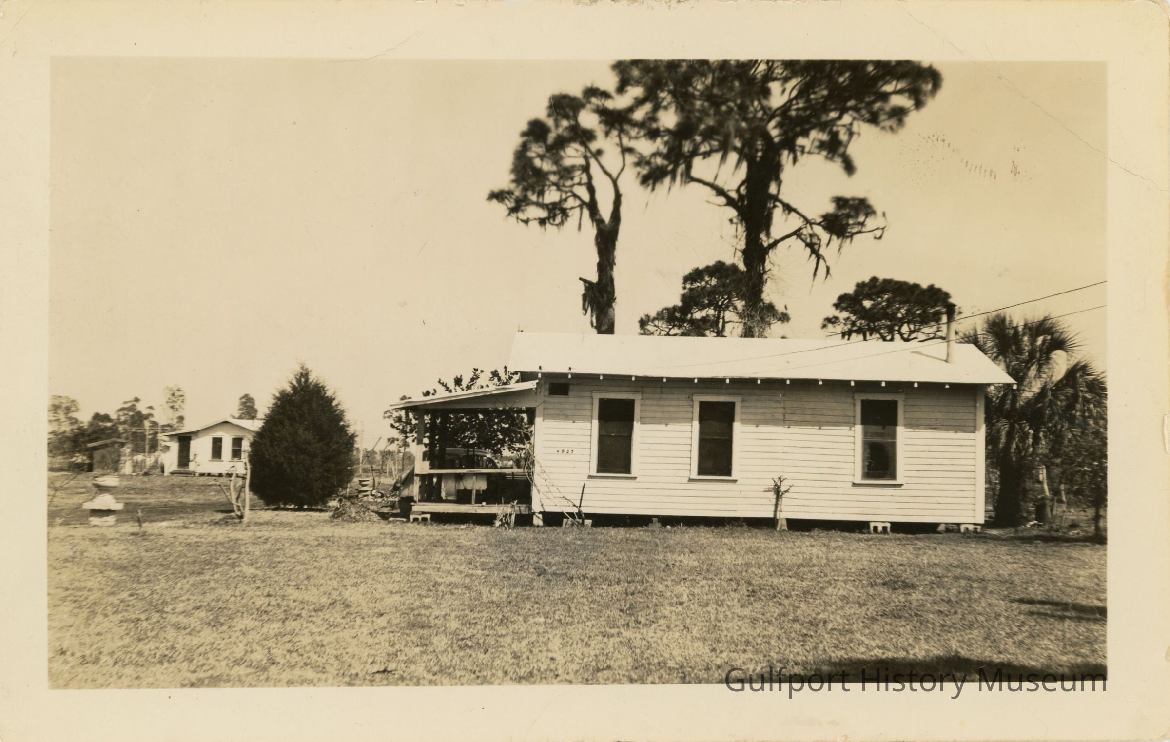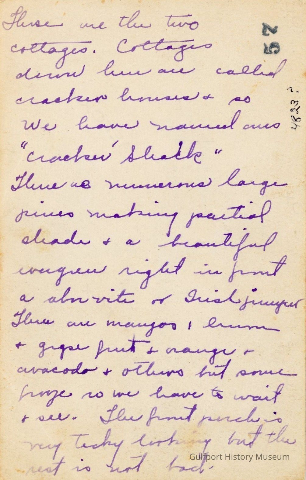 These are the two cottages. Cottages down here are called cracker houses + so we have named ours "Cracker Shack" There are numerous large pines making partial shade + a beautiful evergreen right in front a [?] [?] juniper. There are mangos, [lemon] + grapefruit + orange + avocado + others but some [?] so we have to wait + see. The front porch is very tacky looking but the rest is not bad.