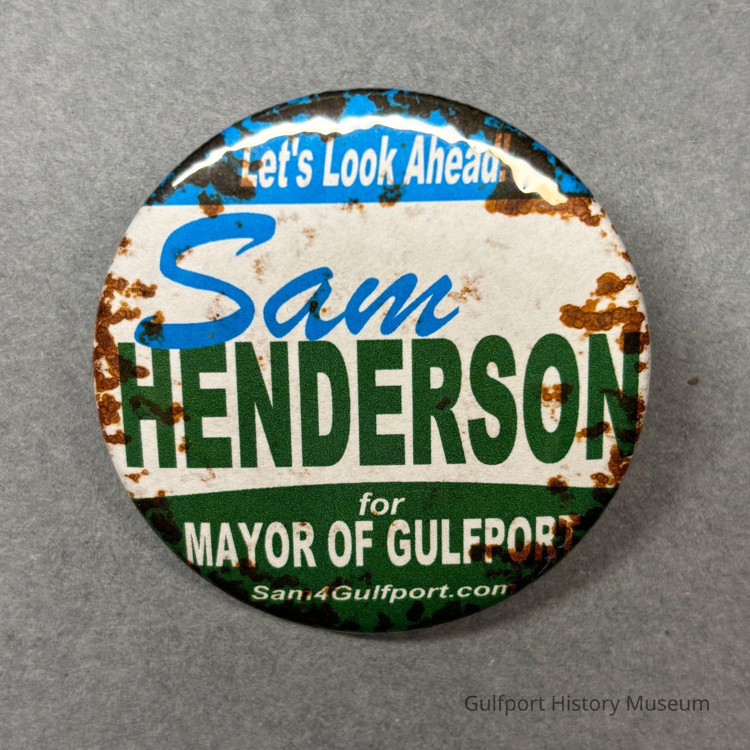 A campaign button badge for a Sam Henderson mayoral campaign.Acquisition