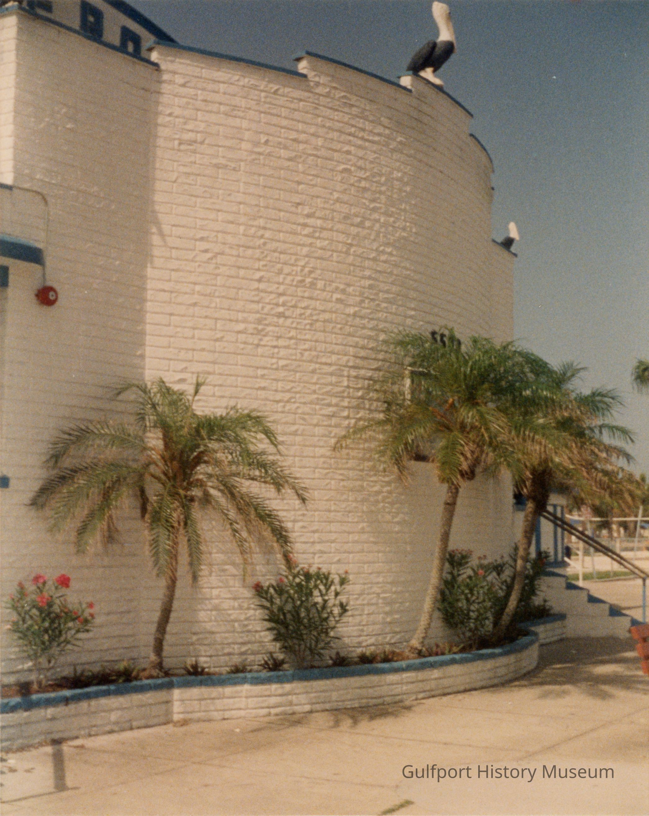 A color photograph of the front of the Gulfport Casino. Palm trees and small flowering bushes are planted along the rounded bandshell. A statue of a pelican sits on the roof.