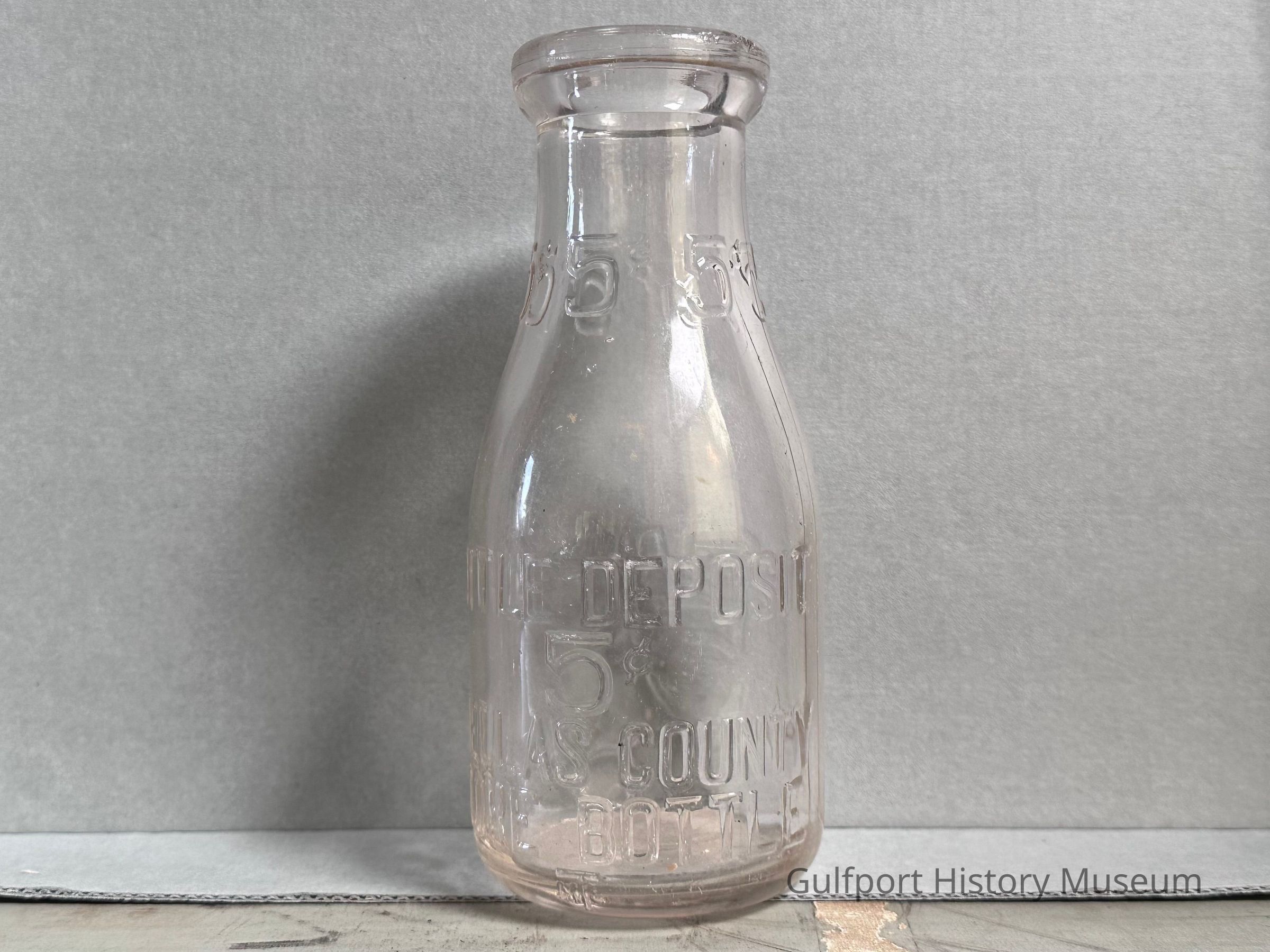 A pint-sized universal store glass milk bottle, with embossed text on the outside.Collection
