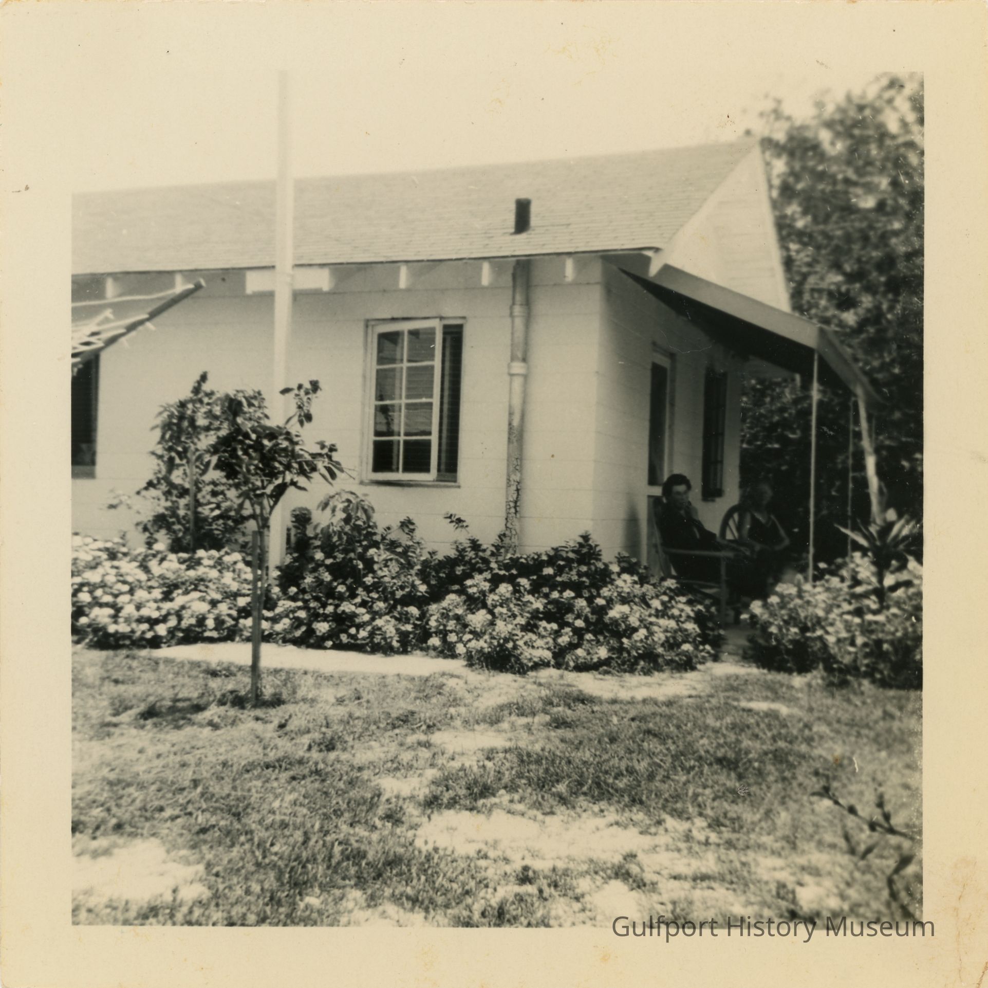 A black and white photograph of a small house. Two women sit on the porch. Many flowering bushes surround the house.