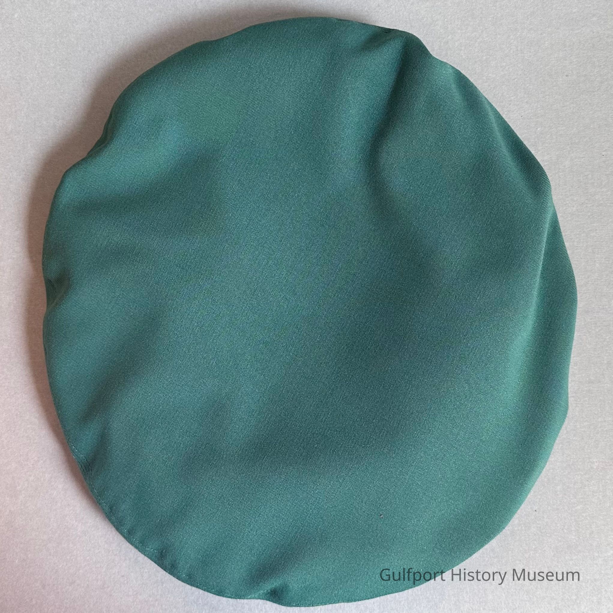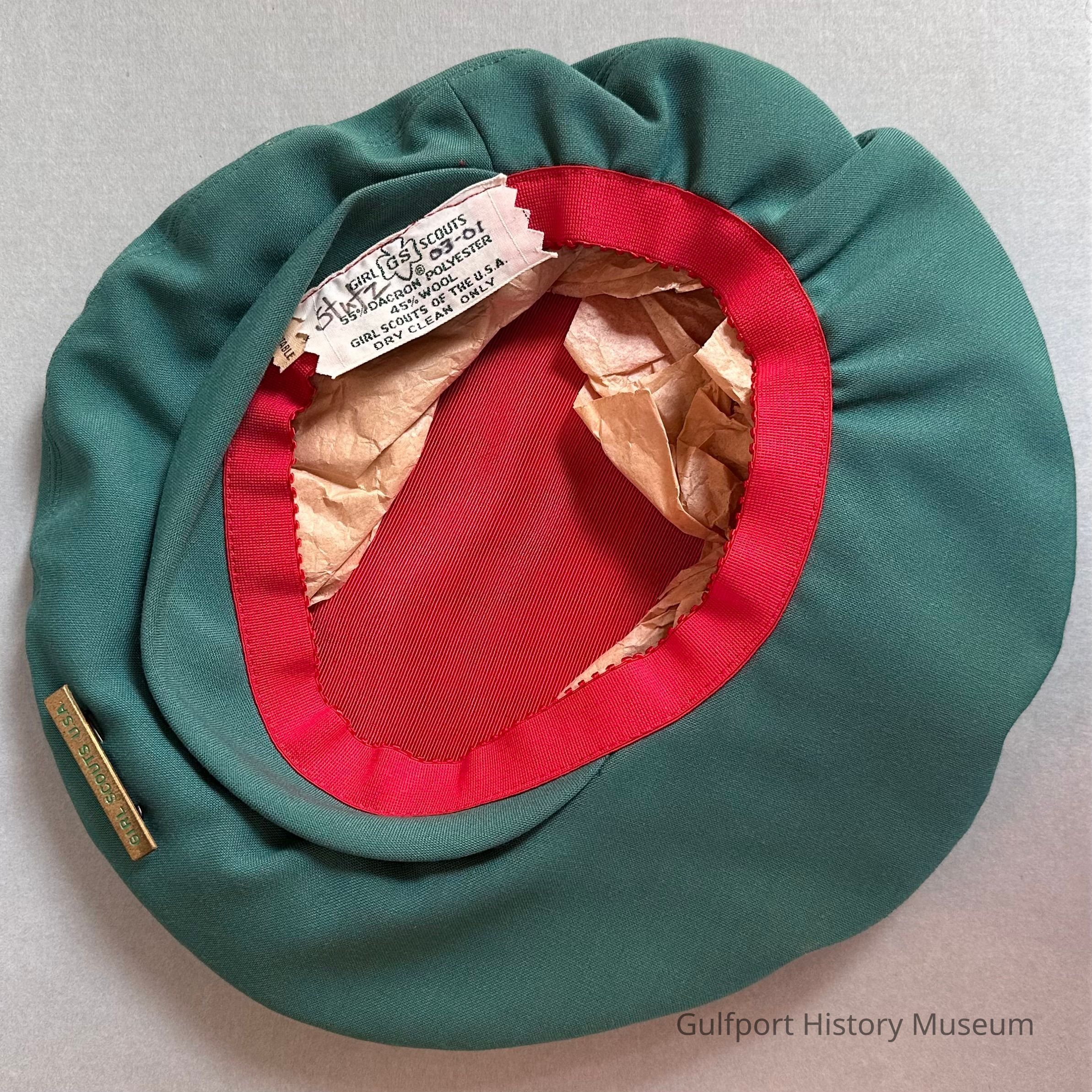 A green beret with red lining and a gold rectangular pin that reads "GIRL SCOUTS U.S.A.".Collection