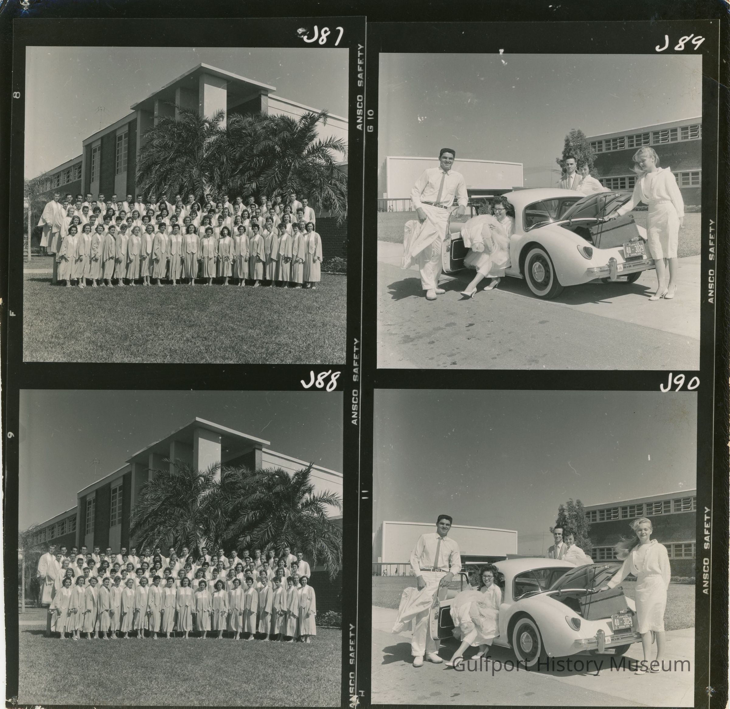 A black and white photograph of four photographs. J87 and J88 show the chorus standing in five rows in robes outside of Boca Ciega High School. J89 and J90 show five students in and around a white car parked outside of the school.Photograph Details