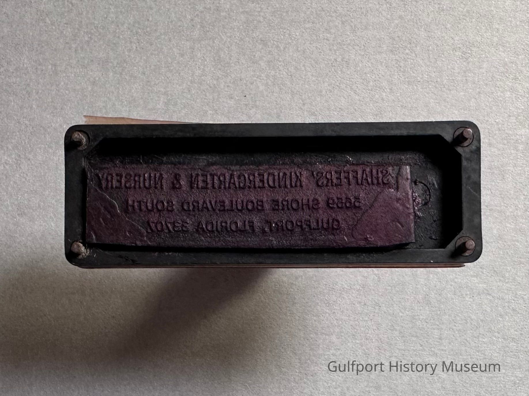 A rubber stamp that, when used, reads: "SHAFFERS' KINDERGARTEN & NURSERY 5969 SHORE BOULEVARD SOUTH GULFPORT, FLORIDA 33707".Collection