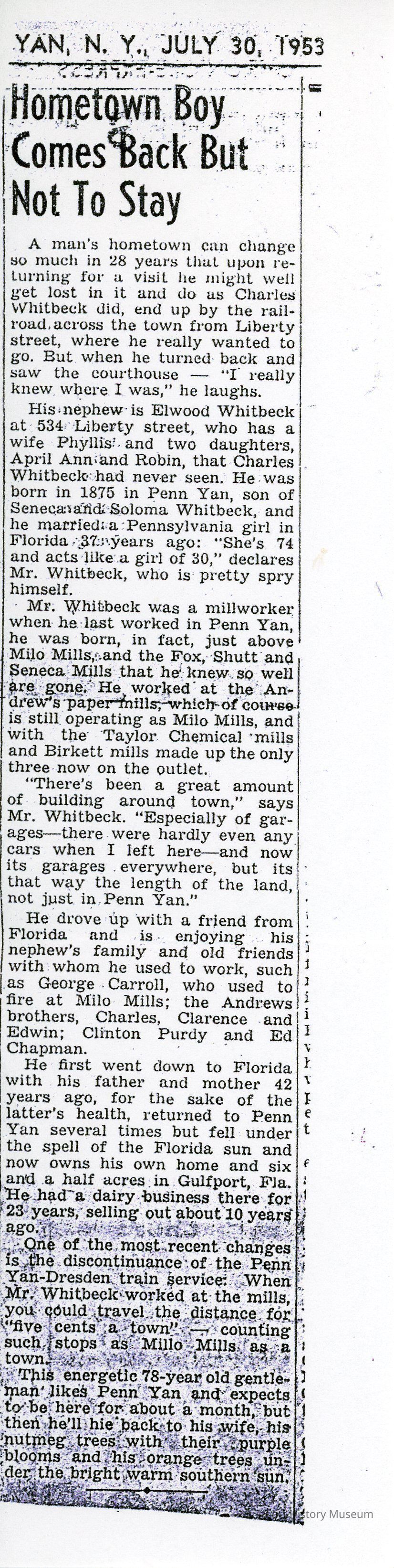 Mr. Whitbeck was a millworker when he last worked in Penn Yan, he was born, in fact, just above Milo Mills, and the Fox, Shutt and Seneca Mills that he knew so well are gone. He worked at the Andrew's paper mills, which of course is still operating as Milo Mills, and with the Taylor Chemical mills and Birkett mills made up the only three now on the outlet.