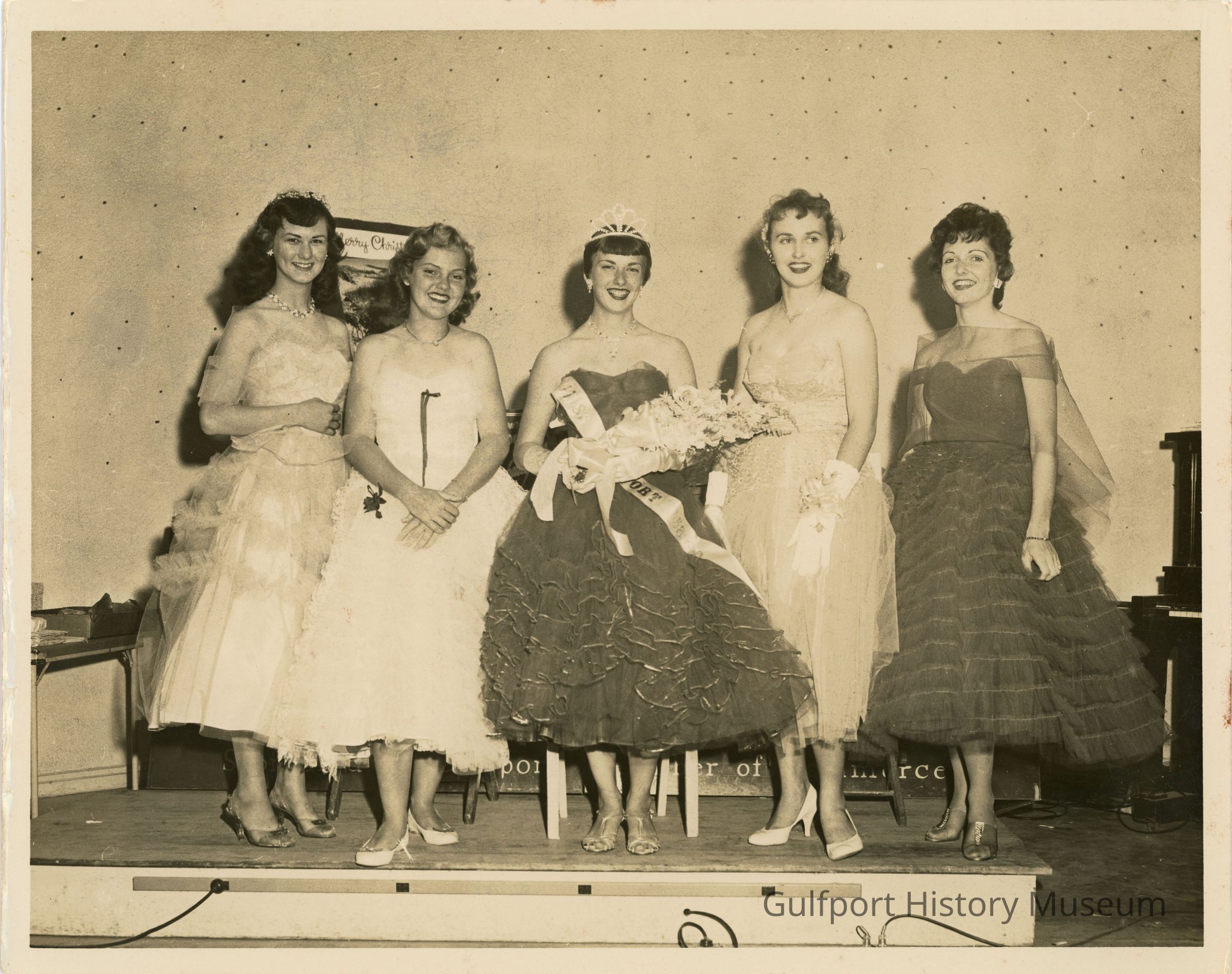 A black and white photograph of the four Gala Days Princesses and the newly crowned Miss Gulfport, Rhoda Clayton. She is holding her bouquet, and wearing a tiara and sash which reads, "Miss Gulfport 58." The five women are wearing elegant formal gowns as they stand on a small stage posing for the photograph. The bottom of a sign on the floor behind them reads, "Gulfport Chamber of Commerce."Photograph Details