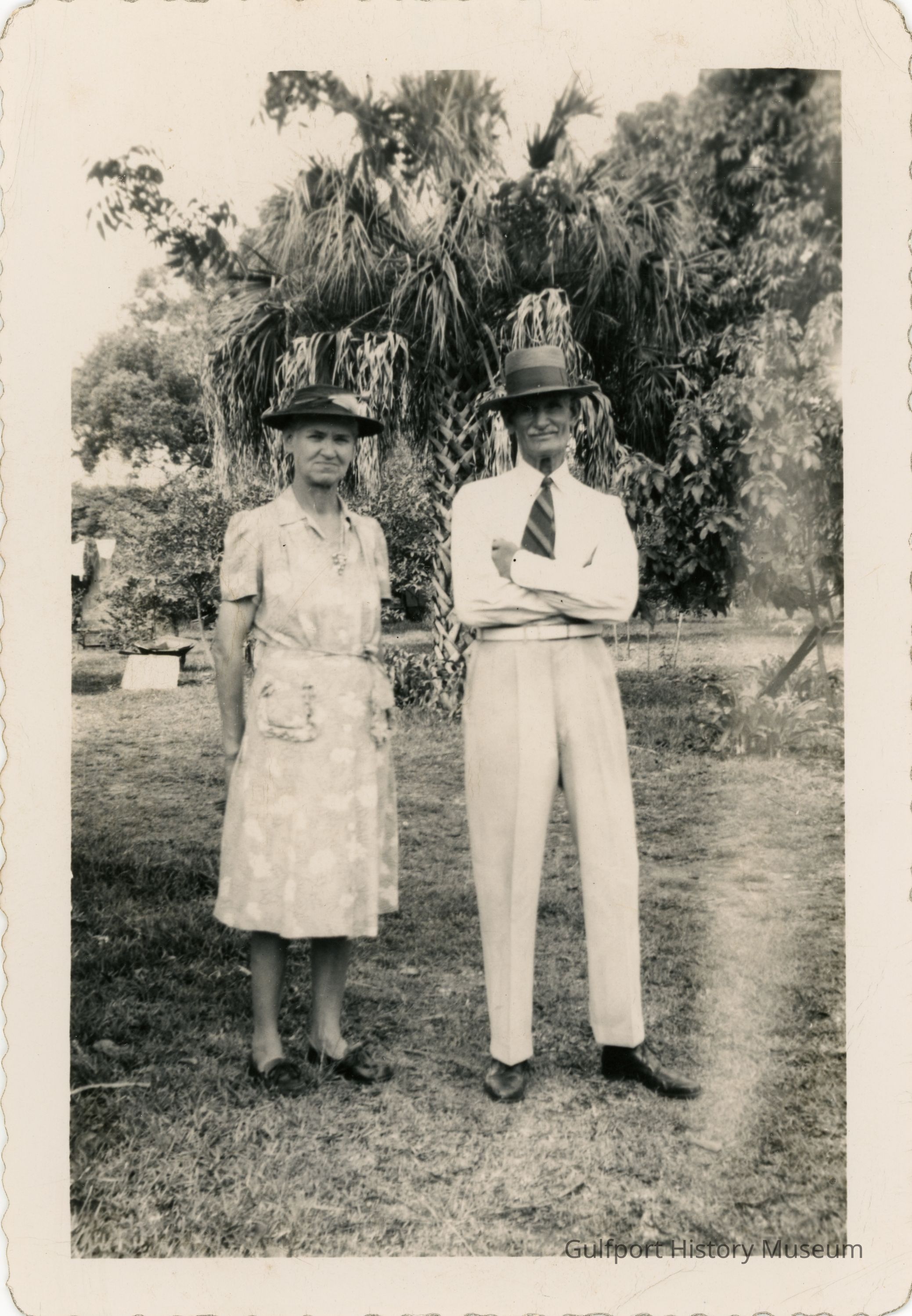 A black and white photograph of a woman and a man, Sarah and Charles Whitbeck, standing outside.Photograph Details
