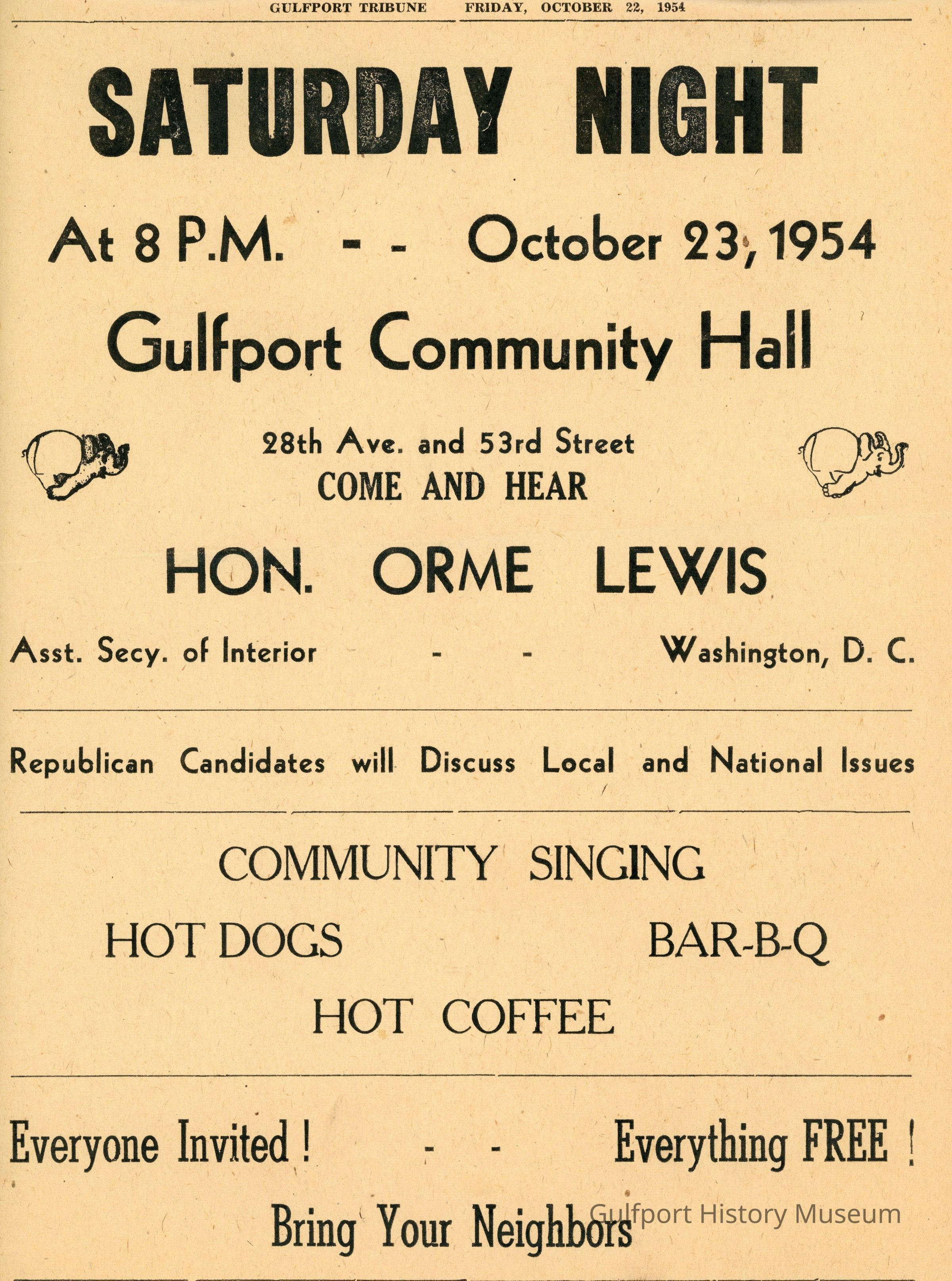 An advertisement from the October 22, 1954 issue of the Gulfport Tribune for an event at Community Hall (Scout Hall) with Hon. Orme Lewis, Assistant Secretary of the Interior, sponsored by Republican Committeemen and Committeewomen of Precincts 59 & 59A.Acquisition