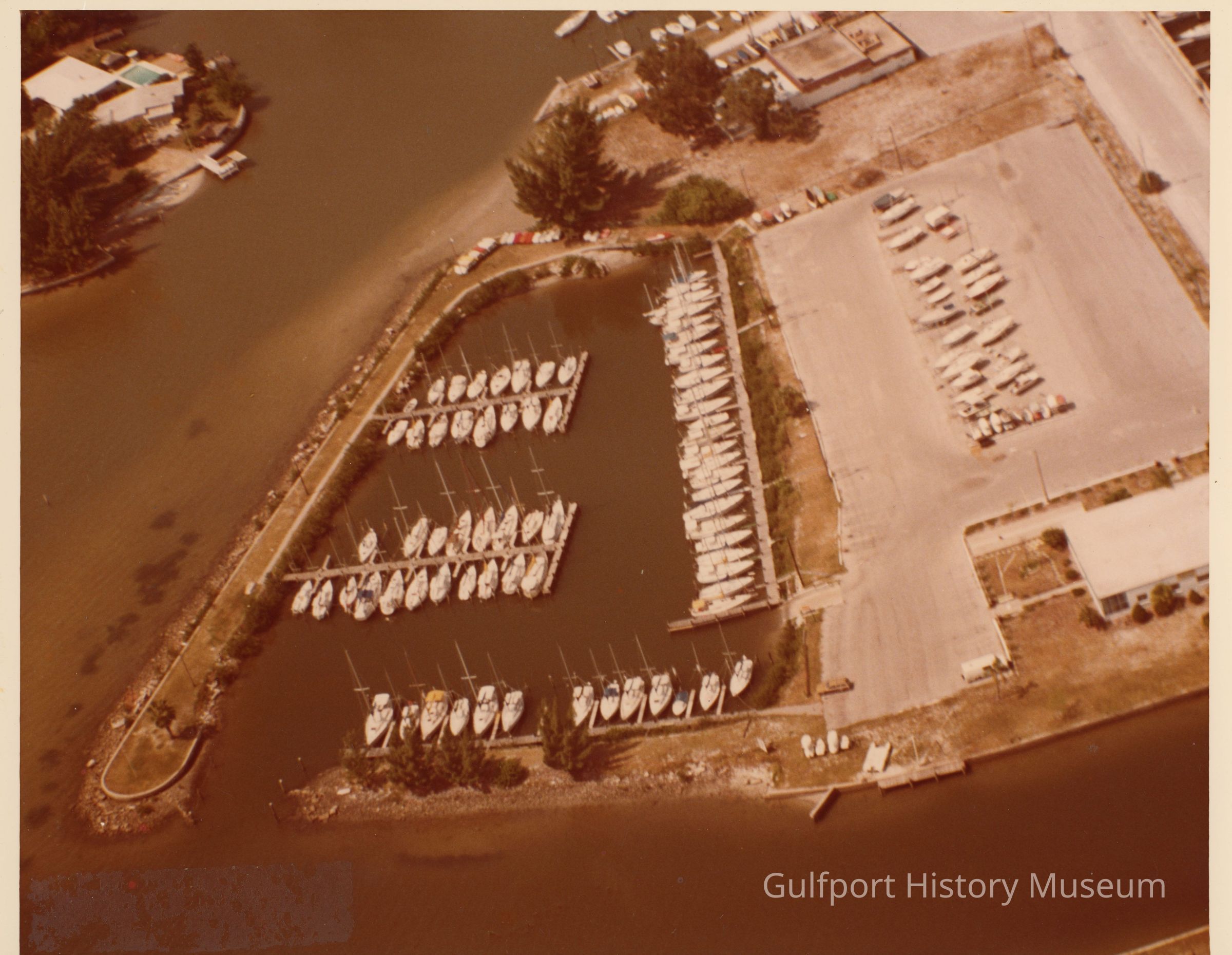 A faded aerial color photograph of the Gulfport Marina, Boca Ciega Yacht Club, and the tip of Baywood Point. Dozens of boats are docked.