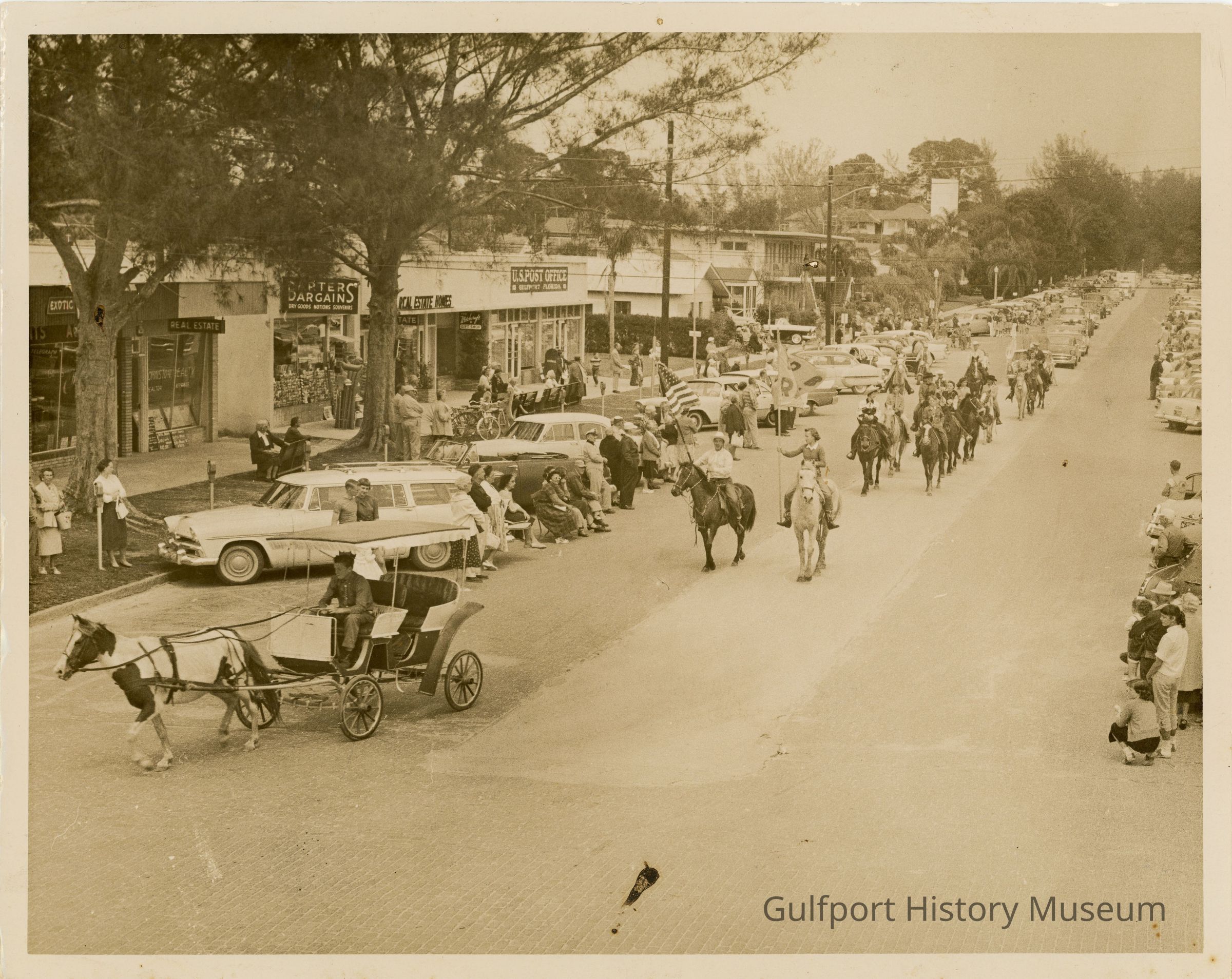 Parades & processions--Florida--Gulfport--1950-1960, Automobiles--1950-1960, Fashion--1950-1960, Horse-drawn vehicles, HorsesSubject Person or Organization