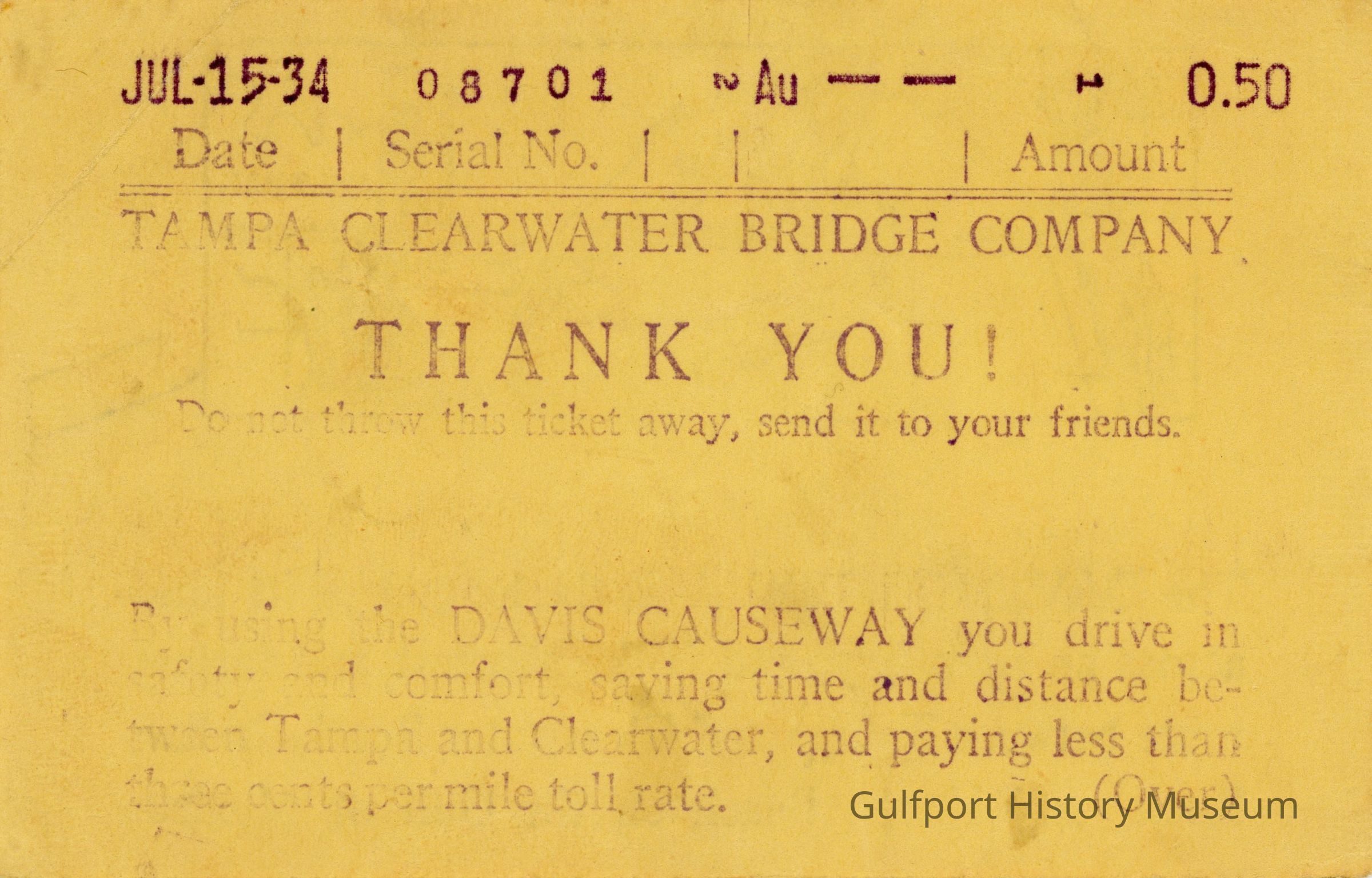 By using the DAVIS CAUSEWAY you drive in safety and comfort, saving time and distance between Tampa and Clearwater, and paying less than three cents per mile toll rate. (Over)Language