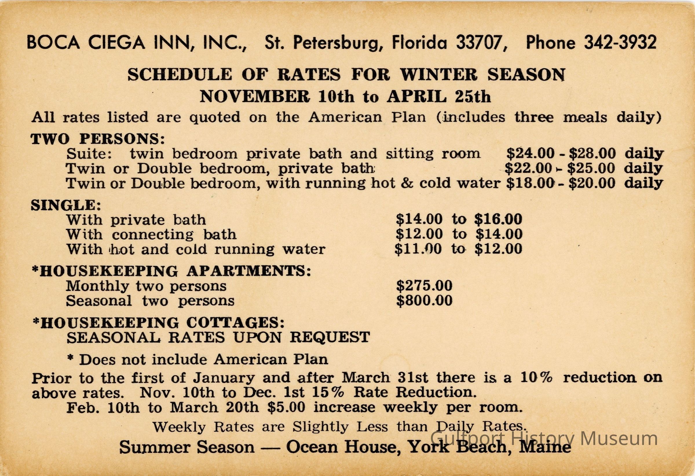 Prior to the first of January and after March 31st there is a 10% reduction on above rates. Nov. 10th to Dec. 1st 15% Rate Reduction.