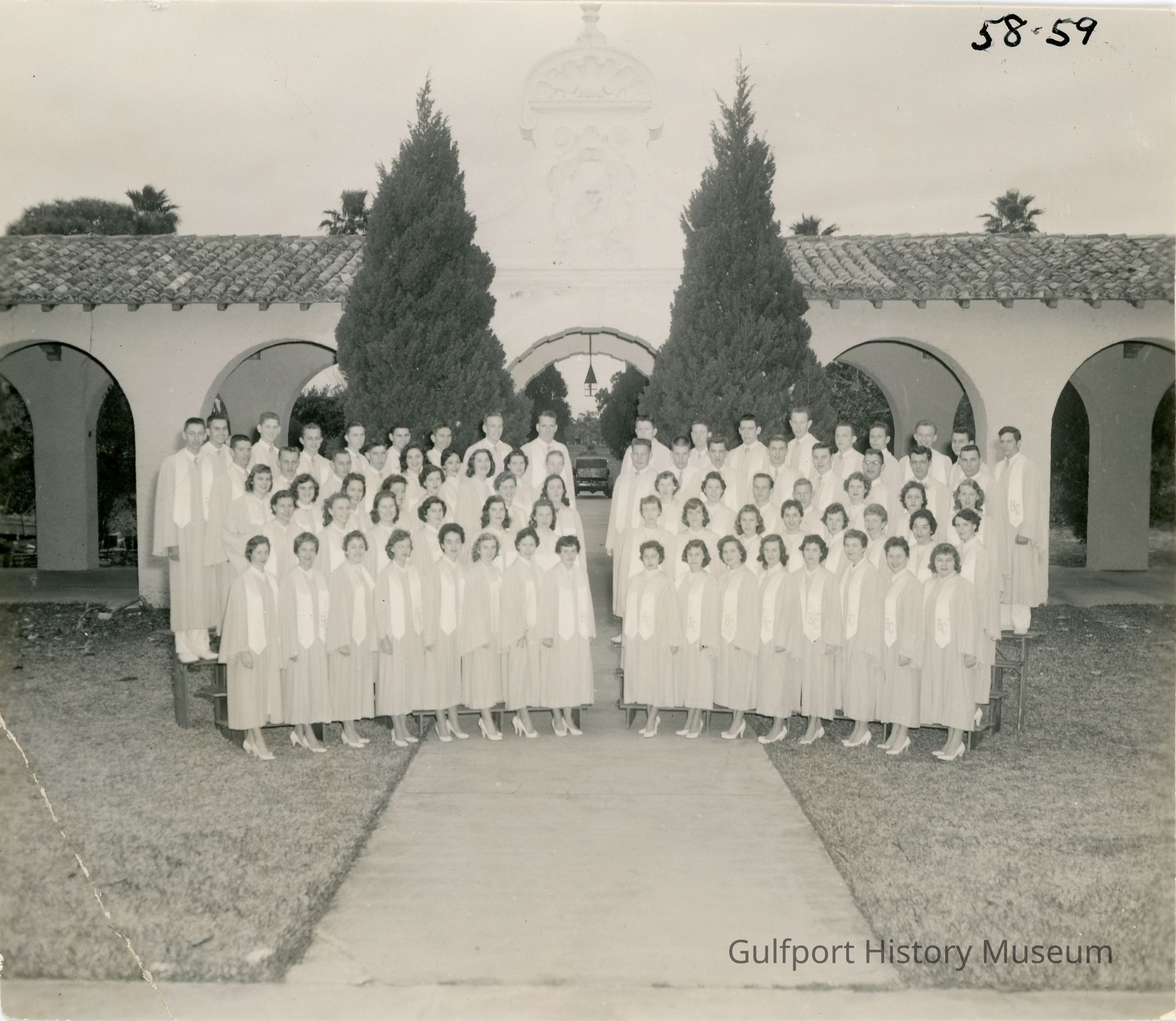 A black and white photograph of a Boca Ciega High School student choir. They stand in five rows in front of an archway in the Plaza Mayor Courtyard at Stetson University College of Law.Photograph Details