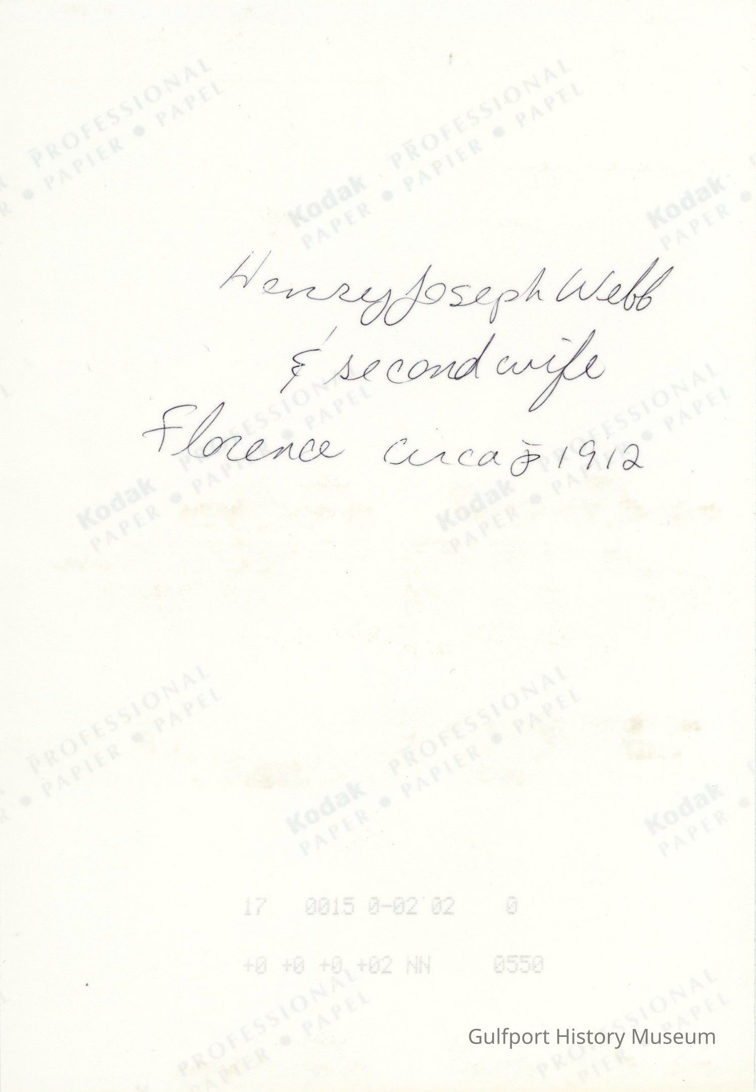 A black and white photographic print of Henry (Harry) Webb (left) and his second wife Florence Bamforth (right). Both are dressed formally; Henry wears a dark suit and striped tie with a lapel flower and Florence is in a lightly colored dress and holds a bouquet of flowers.Photograph Details