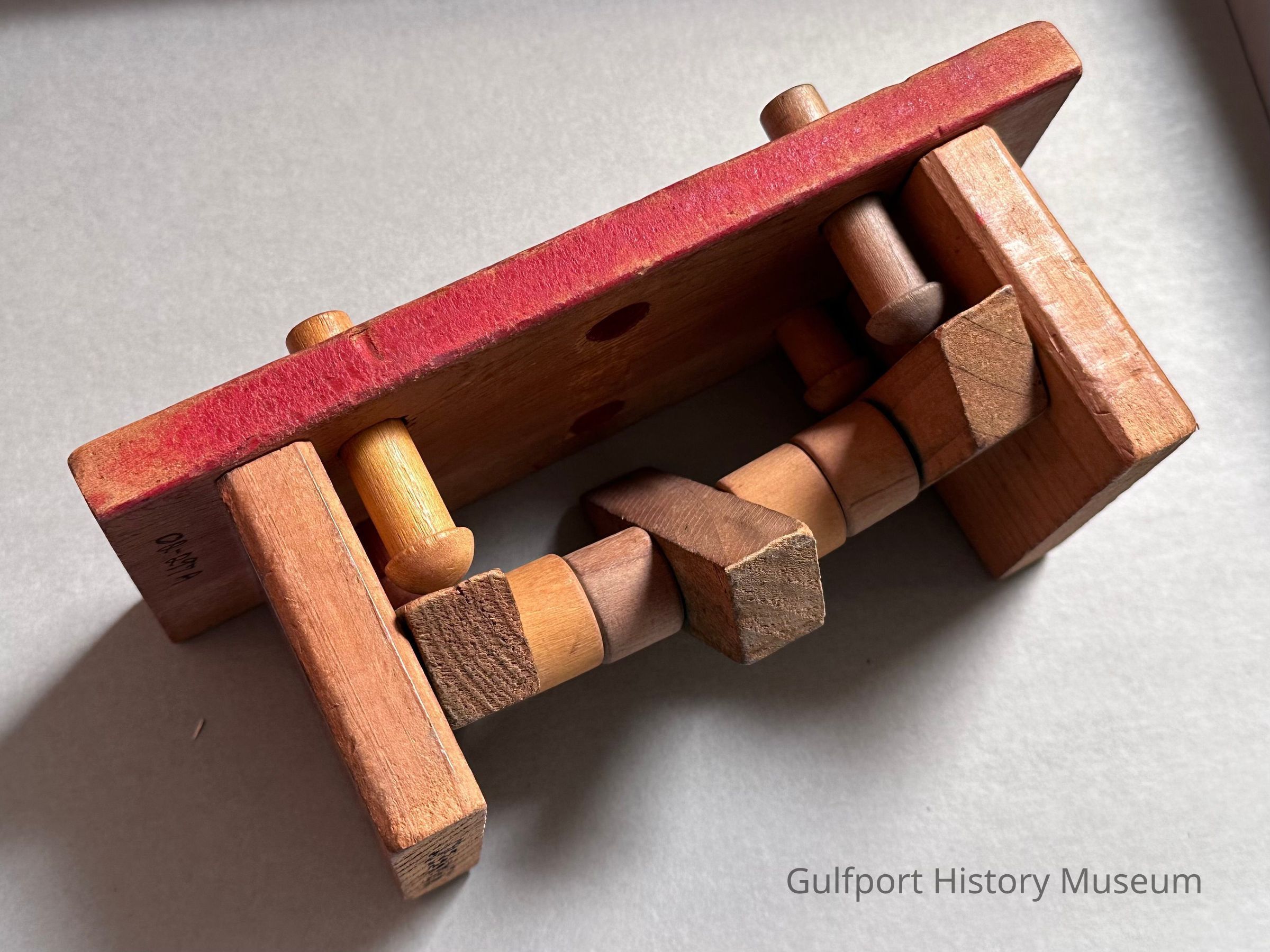 A wooden peg bench toy. Paint on the side reads, "POP-UP PEG BENCH." "POP - UP" is also written on the top. The toy consists of several wooden pegs in a table-like structure, with rotating wooden pieces below the pegs, creating a mechanism where as one peg is pushed in, a peg opposing it will be pushed up.Collection