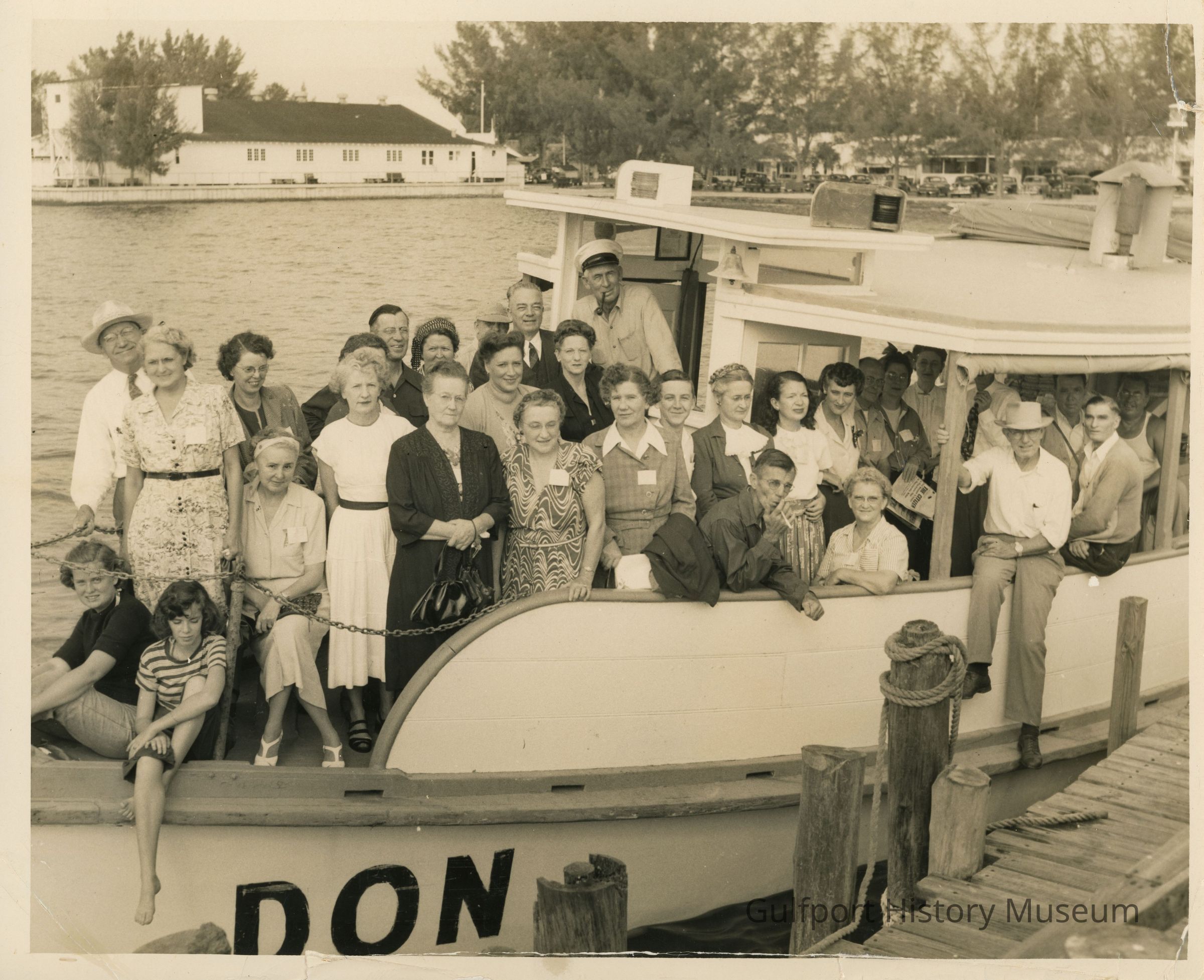 "An outing on the Don. Captain Walter Williams, center back with pipe, was Mayor of Gulfport at this time. 1947."