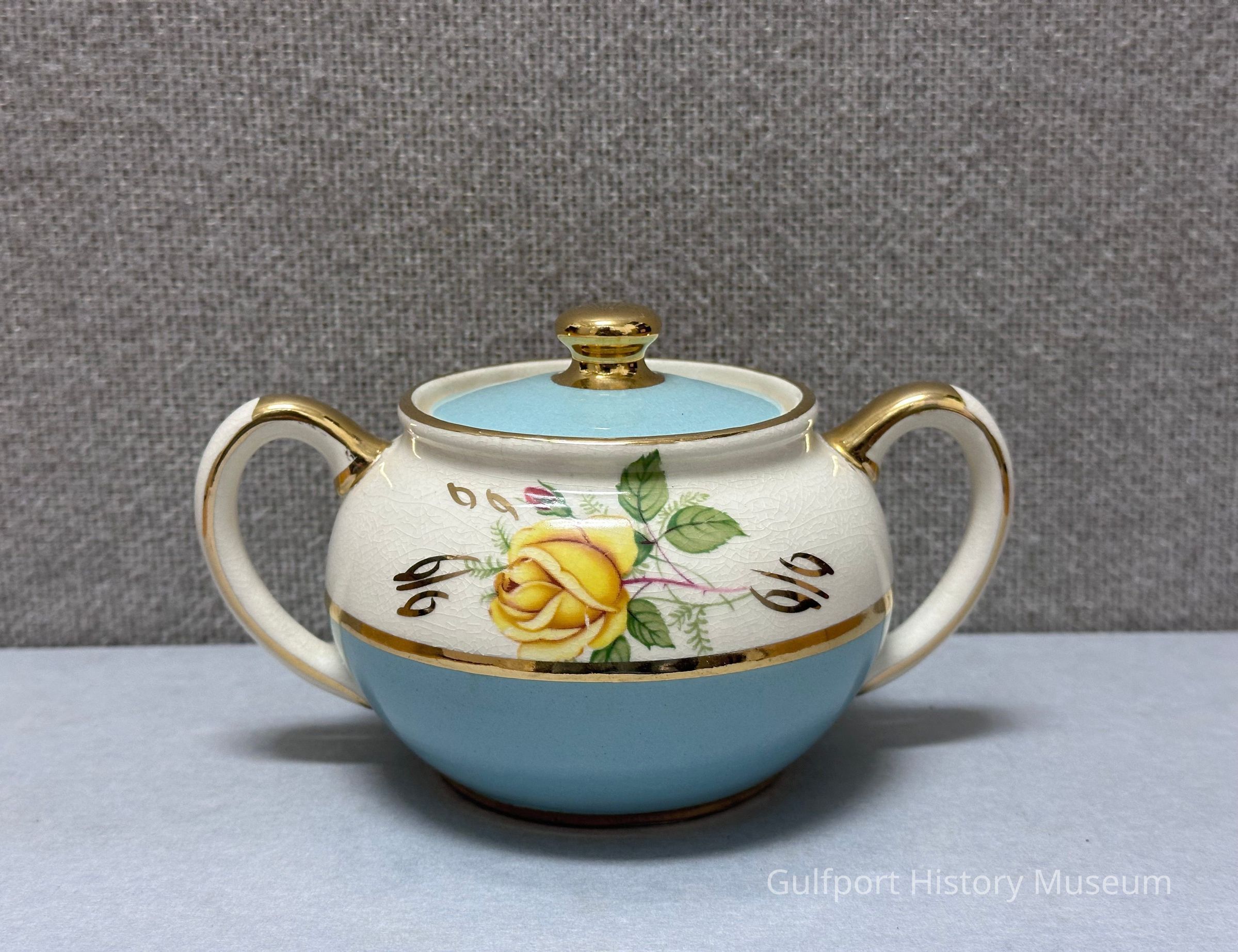 A Sadler sugar bowl with a pink, yellow, and green floral design, robin egg blue accents, and gold trim.Context
