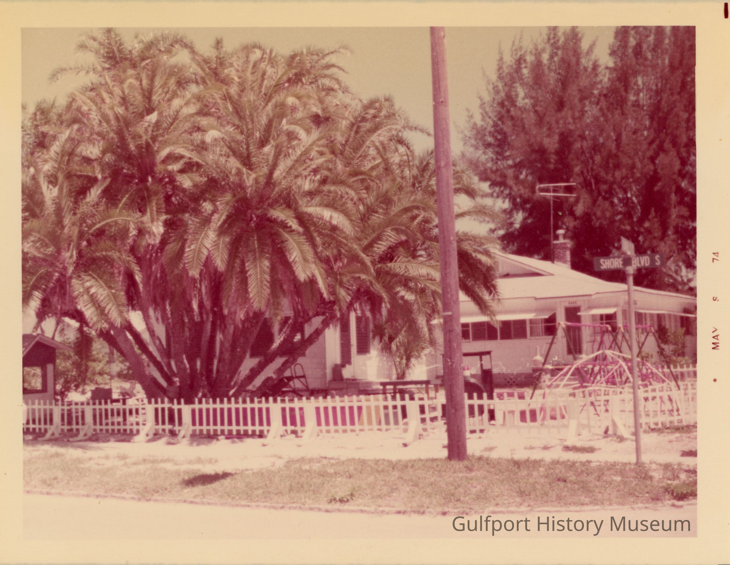 A photograph of Shaffers' from Shore Blvd S at Clinton St. It is a large, white house with a white picket fence. There are palm trees and various play equipment in the yard. The right side of the photograph has text that reads "MAY 8 74".Photograph Details
