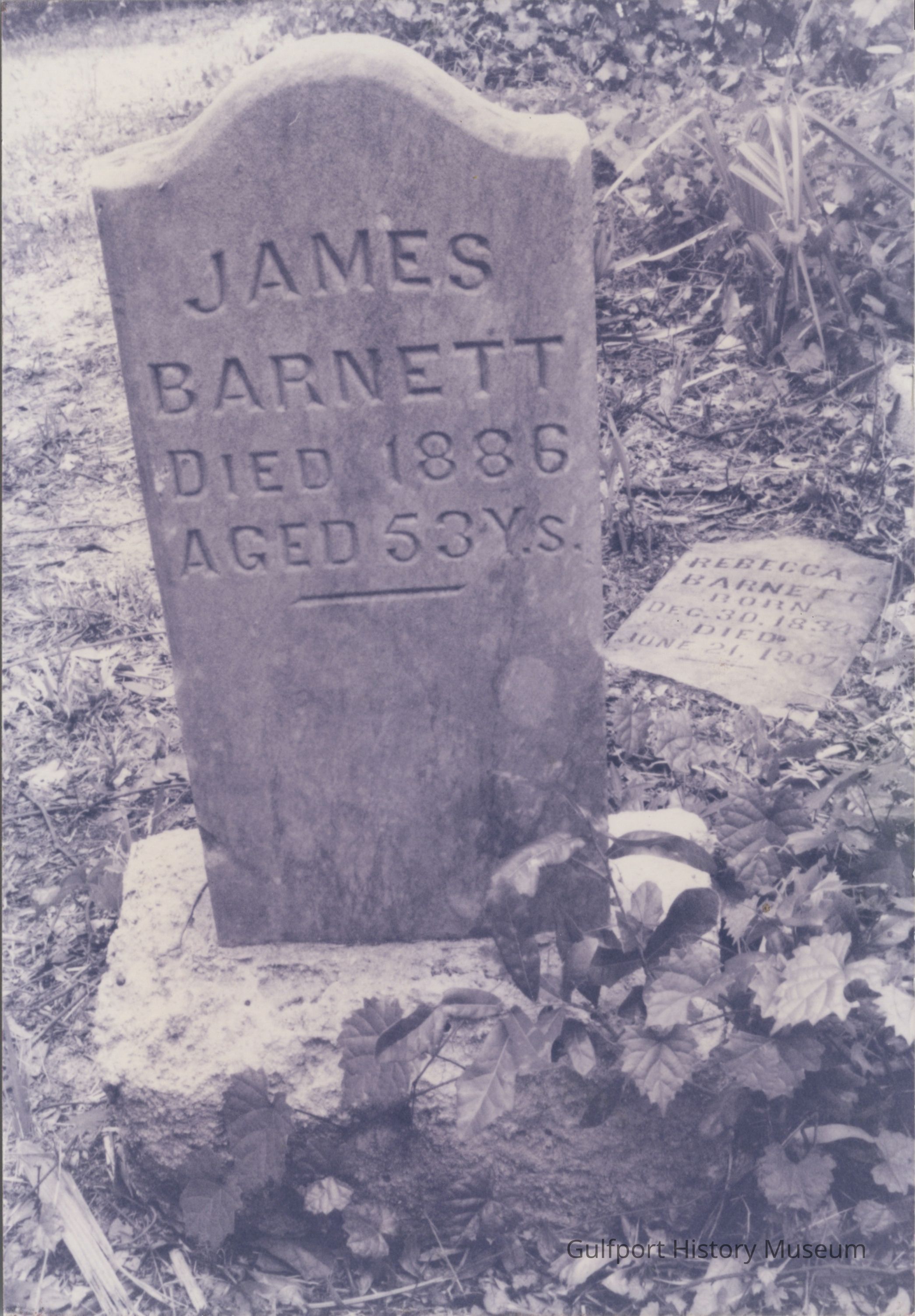 A black and white photograph of headstones and graves of James Barnett and Rebecca Barnett at Glen Oak (Glen Oaks) Cemetery near 2012 Auburn St in St. Petersburg. Rebecca's headstone has fallen over and lies flat on the ground.