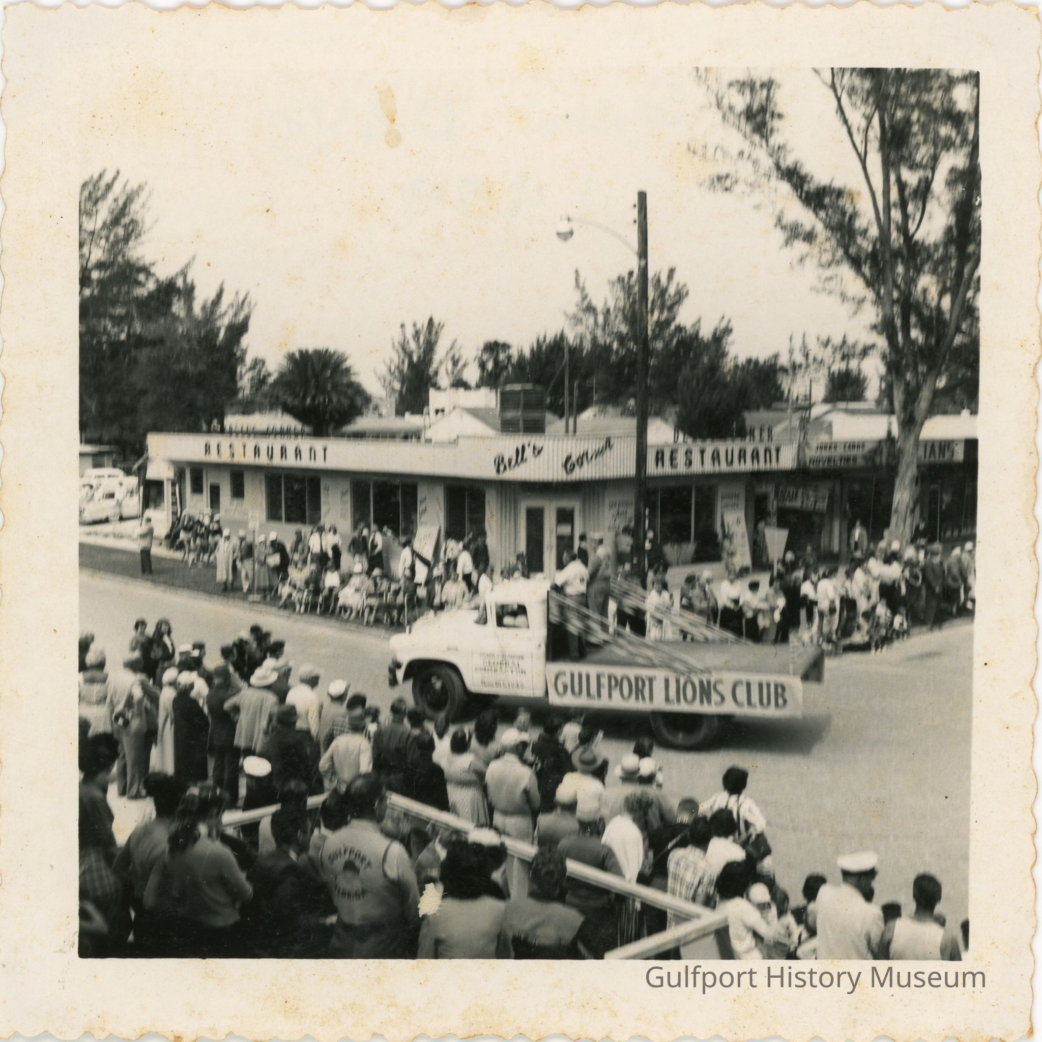 A black and white photograph of the Gala Days Parade as a flatbed truck decorated with a Gulfport Lions Club sign turns from Beach Blvd onto Shore Blvd in front of Bell's Corner Restaurant. Onlookers are standing along either side of the street watching the procession.Photograph Details