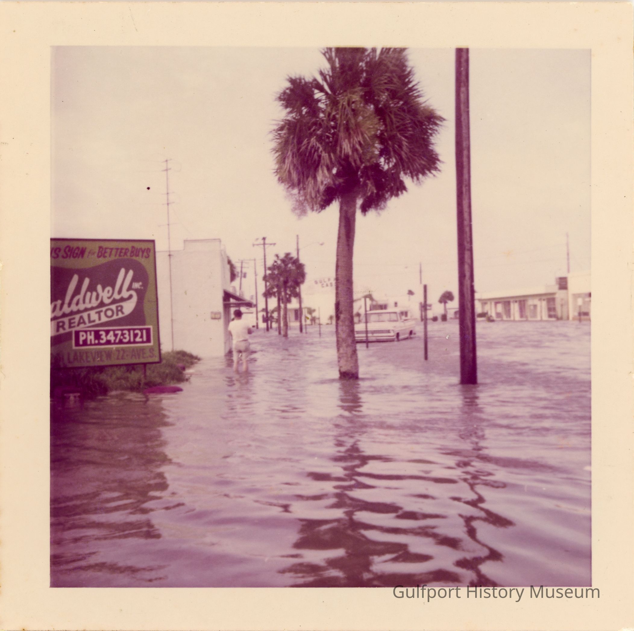 A color photograph of Beach Blvd flooding during a storm. The water has completely covered the street and sidewalks. There is a man standing in the calf deep water in shorts and a t-shirt near a Caldwell Realtor (located on Lakeview, now Gulfport Blvd) sign. There is a small truck parked in the road. The Gulfport Casino is visible in the background at the end of the road.