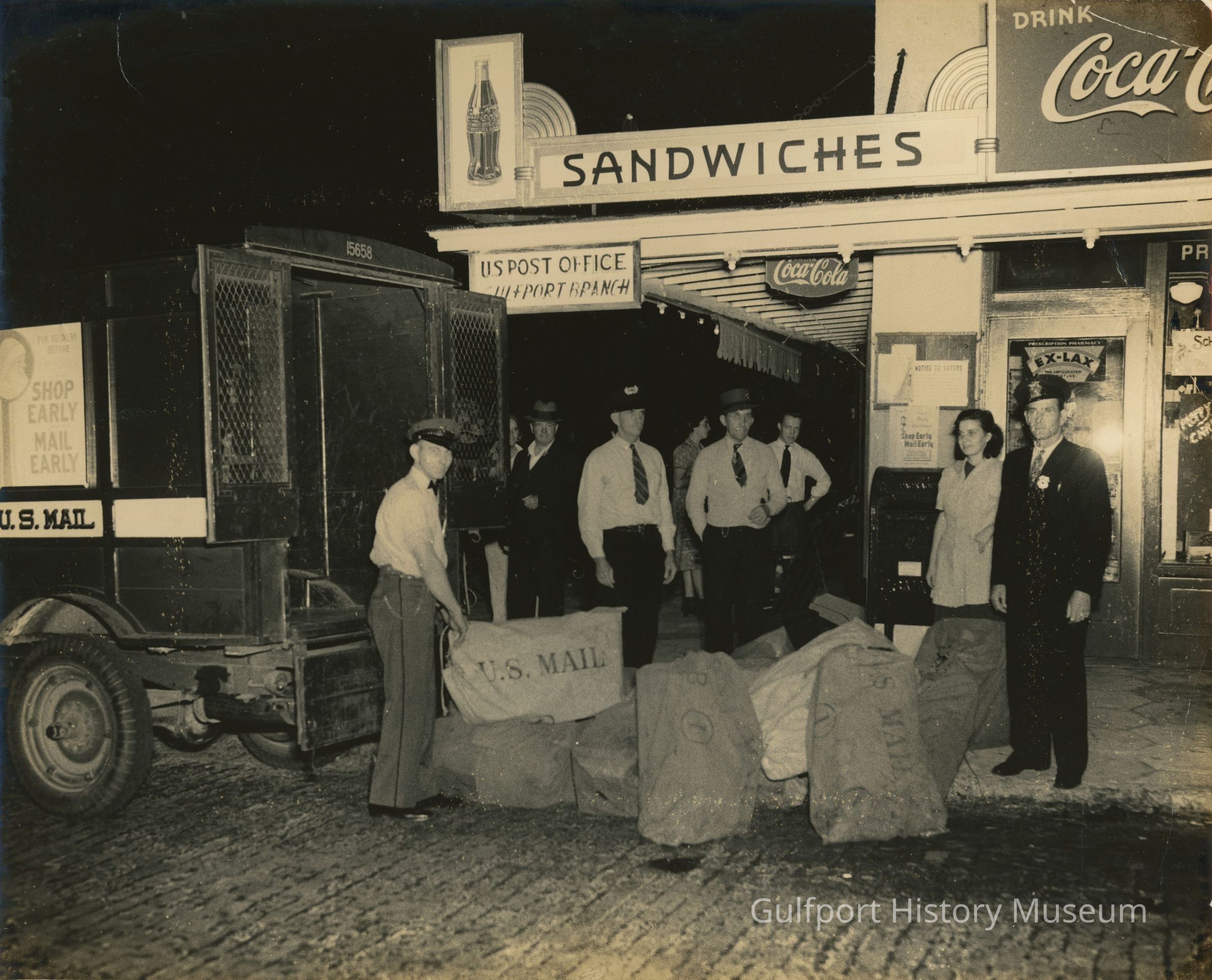 A black and white photograph of postal workers standing in front of a pharmacy/soda fountain/restaurant [at 2832 Beach Blvd] receiving a mail delivery from a U.S. Mail truck. Several bags of mail sit on the street and sidewalk. The building behind them features a sign on the top left hand corner of the awning which reads, "US POST OFFICE GULFPORT BRANCH."Photograph Details