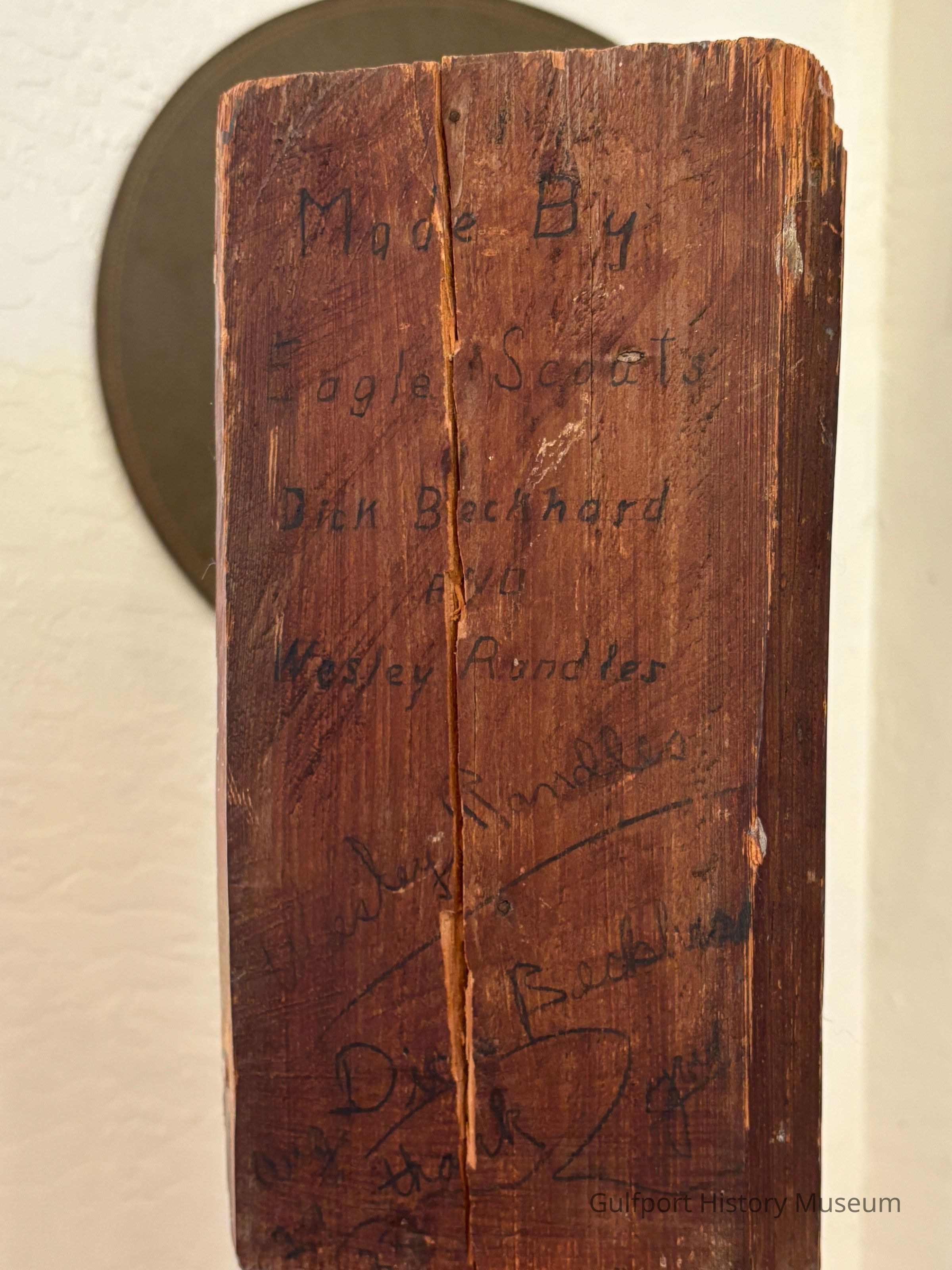 A wooden pole carved and painted with Eagle and Boy Scouts merit badges and imagery. "BE PREPARED"