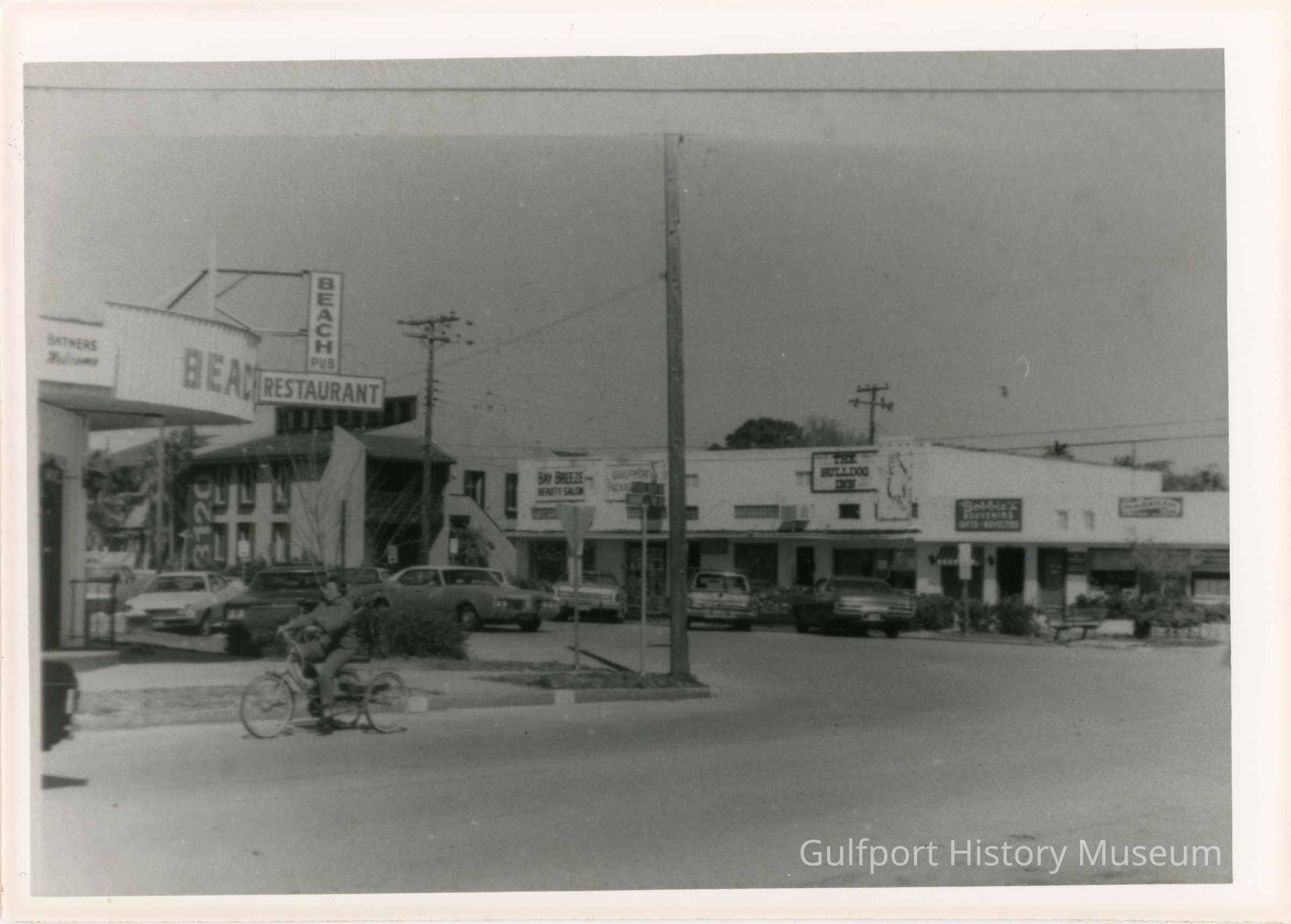 A black and white photograph of the intersection of Beach Blvd S and Shore Blvd S looking northeast. Visible businesses include the Beach Pub Restaurant, Bay Breeze Beauty Salon, Gulfport Packaging, The Bulldog Inn, Bobbie's Souvenirs, and Markham Realty. Cars are parked along the street and someone rides a bicycle.Photograph Details