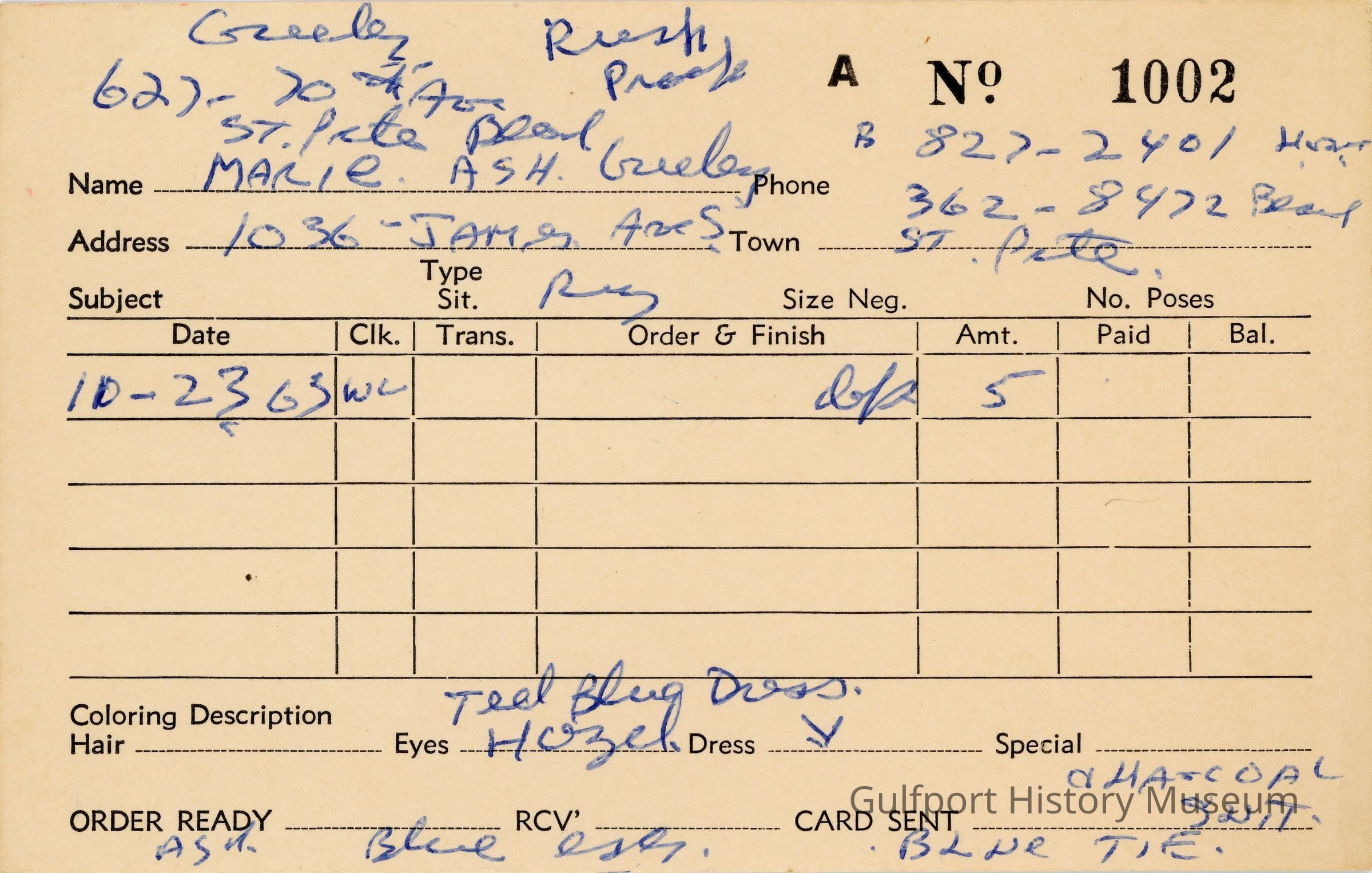 A photography studio order form filled out in blue ink. It reads, "A No. 1002."Context