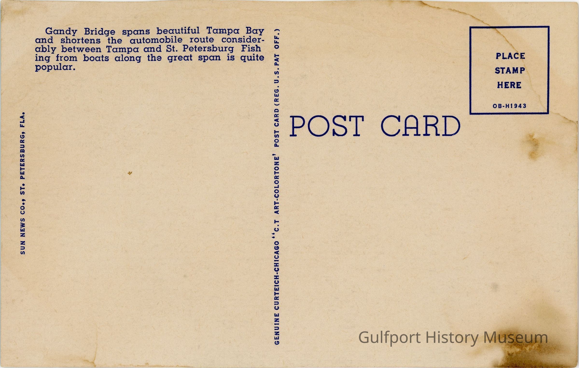 Gandy Bridge spans beautiful Tampa Bay / and shortens the automobile route consider- / ably between Tampa and St. Petersburg. Fish / ing from boats along the great span is quite / popular.Transcriber