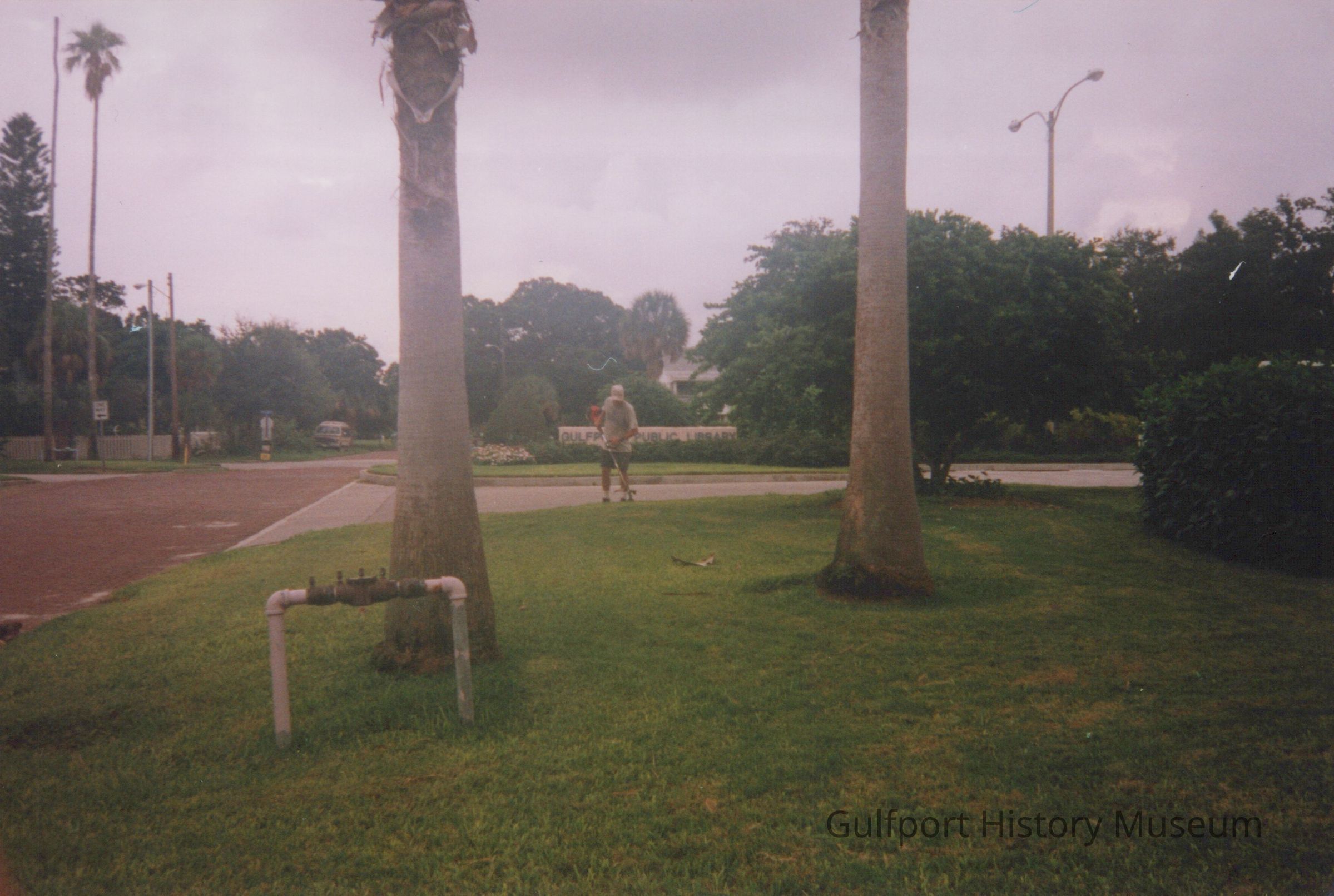 A color photograph of the entrance to the parking lot of the Gulfport Public Library. A man performs landscaping work.Photograph Details