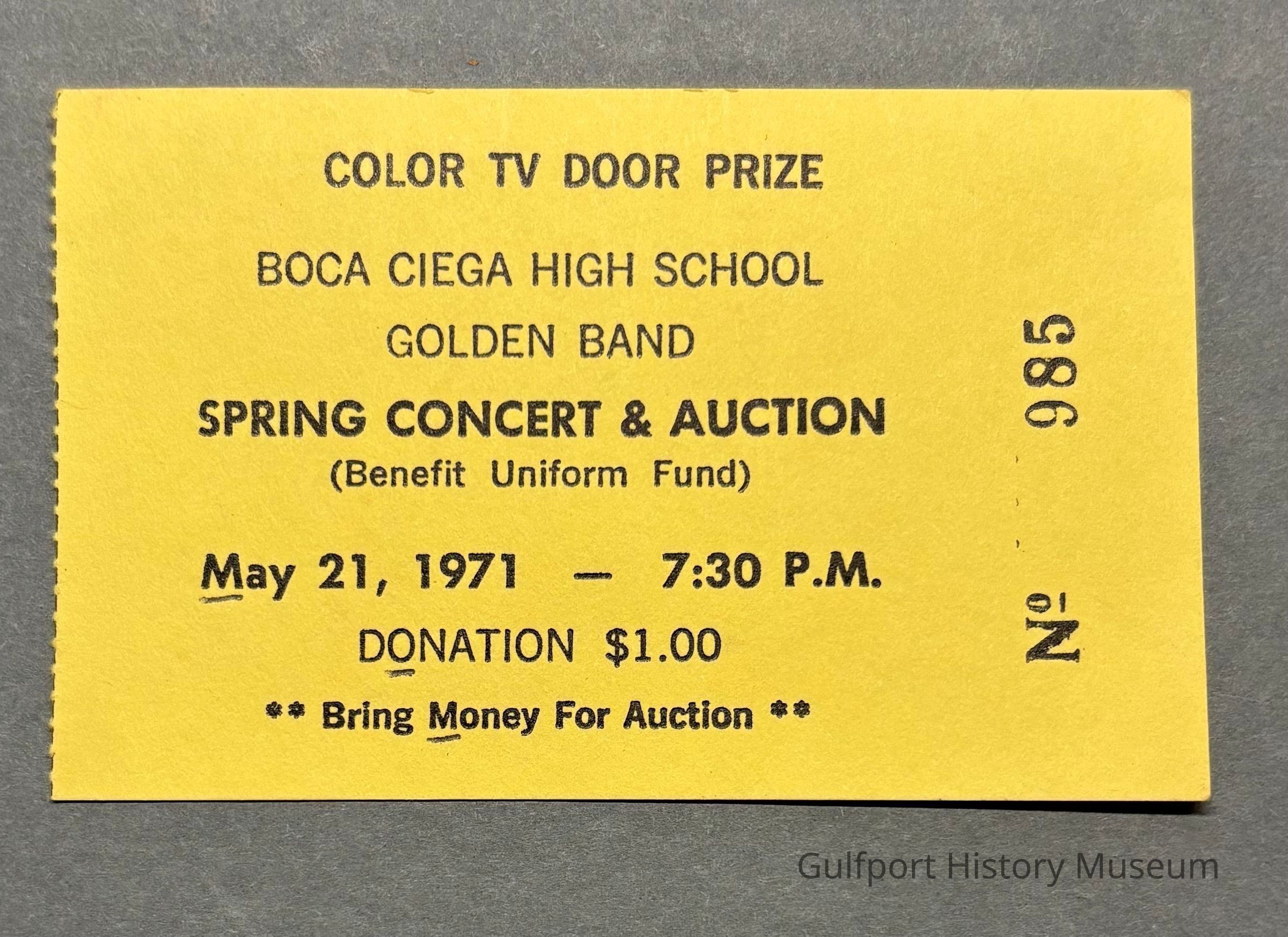 An admission ticket to the Boca Ciega High School Golden Band's Spring Concert and Auction, held on May 21, 1971.