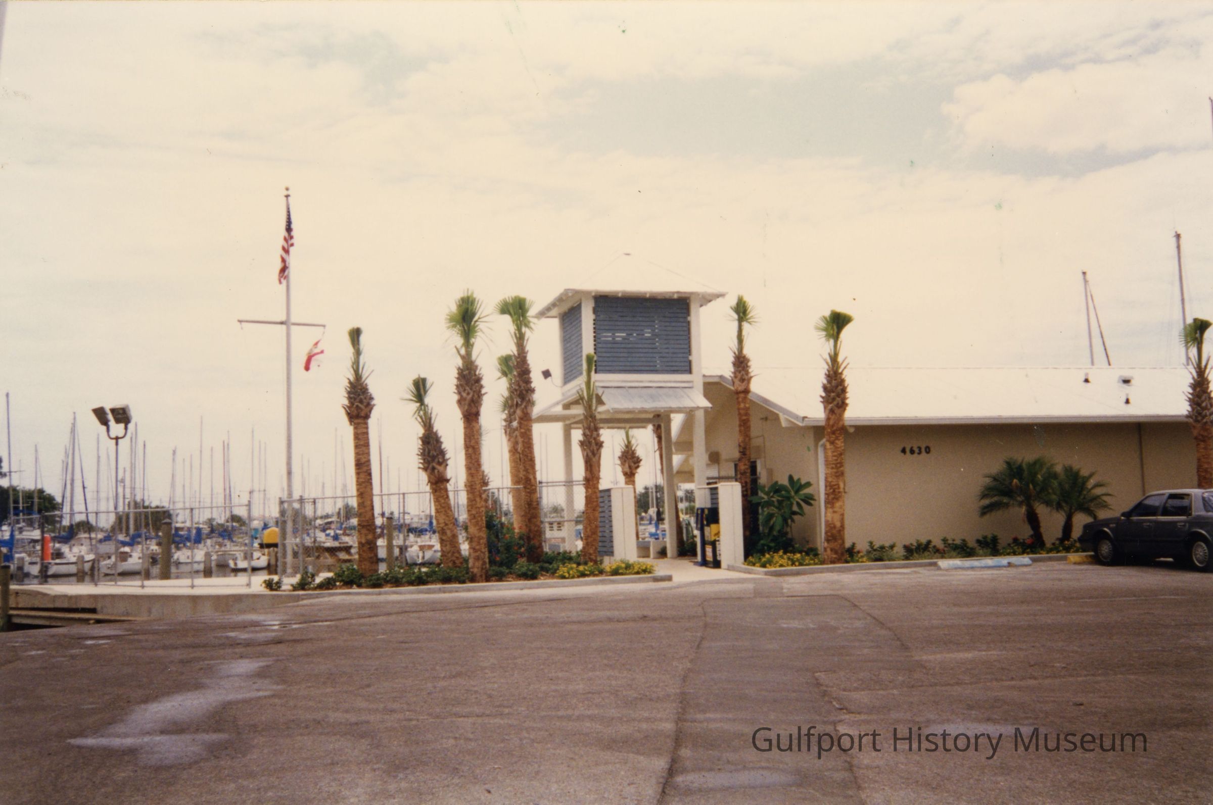 A color photograph of the Gulfport Marina building. Palm trees surround the entrance and docked sailboats are visible in the water beyond.Photograph Details