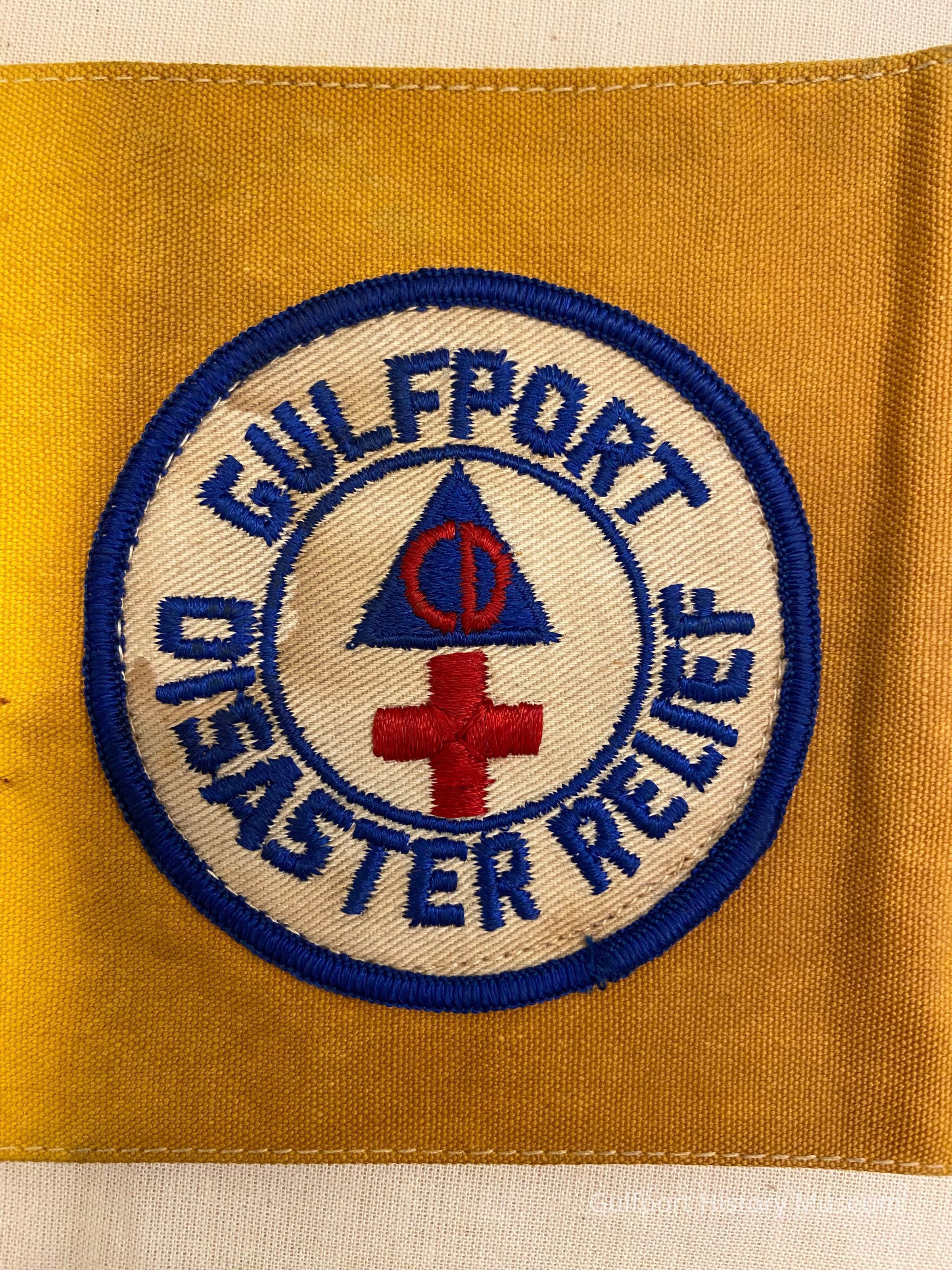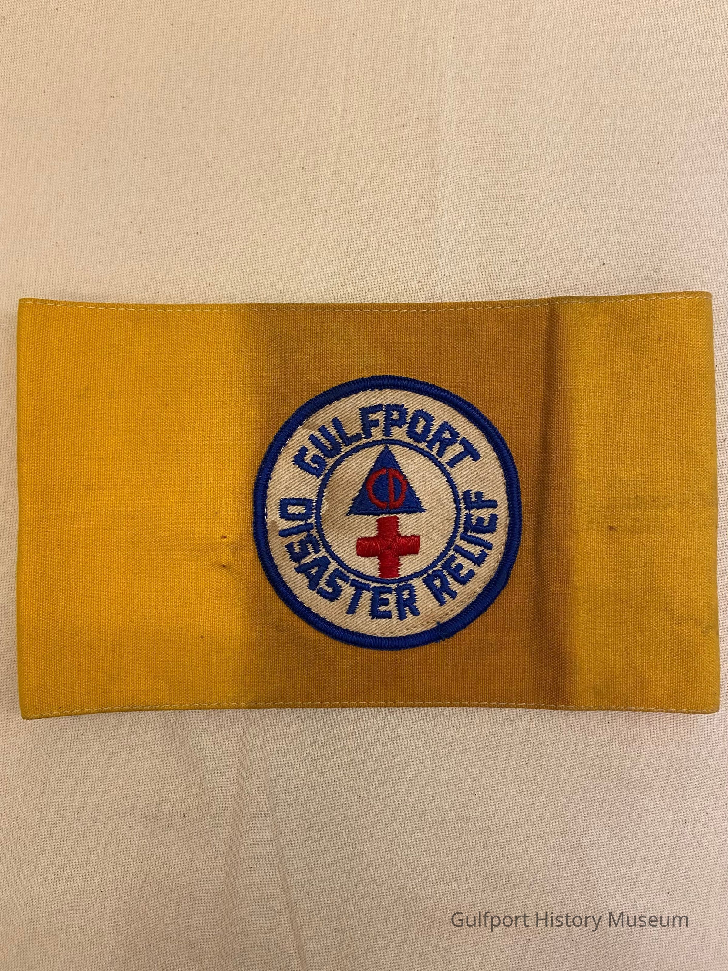 A yellow armband with a circular Gulfport Disaster Relief patch.Acquisition