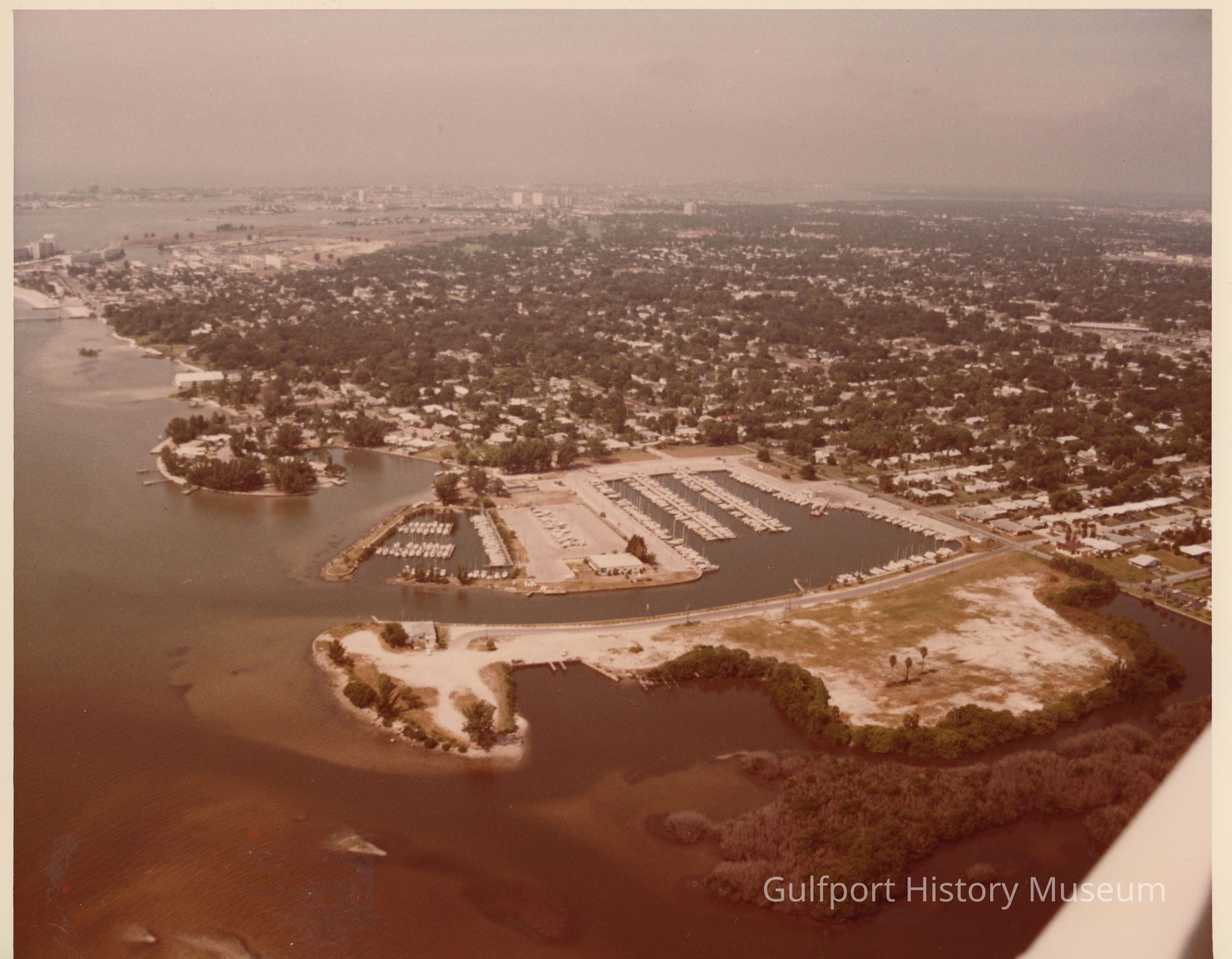 A faded aerial color photograph of the Gulfport Marina, Boca Ciega Yacht Club, Osgood Point (Clam Bayou Nature Park), and, further, Gulfport. Dozens of boats are docked.