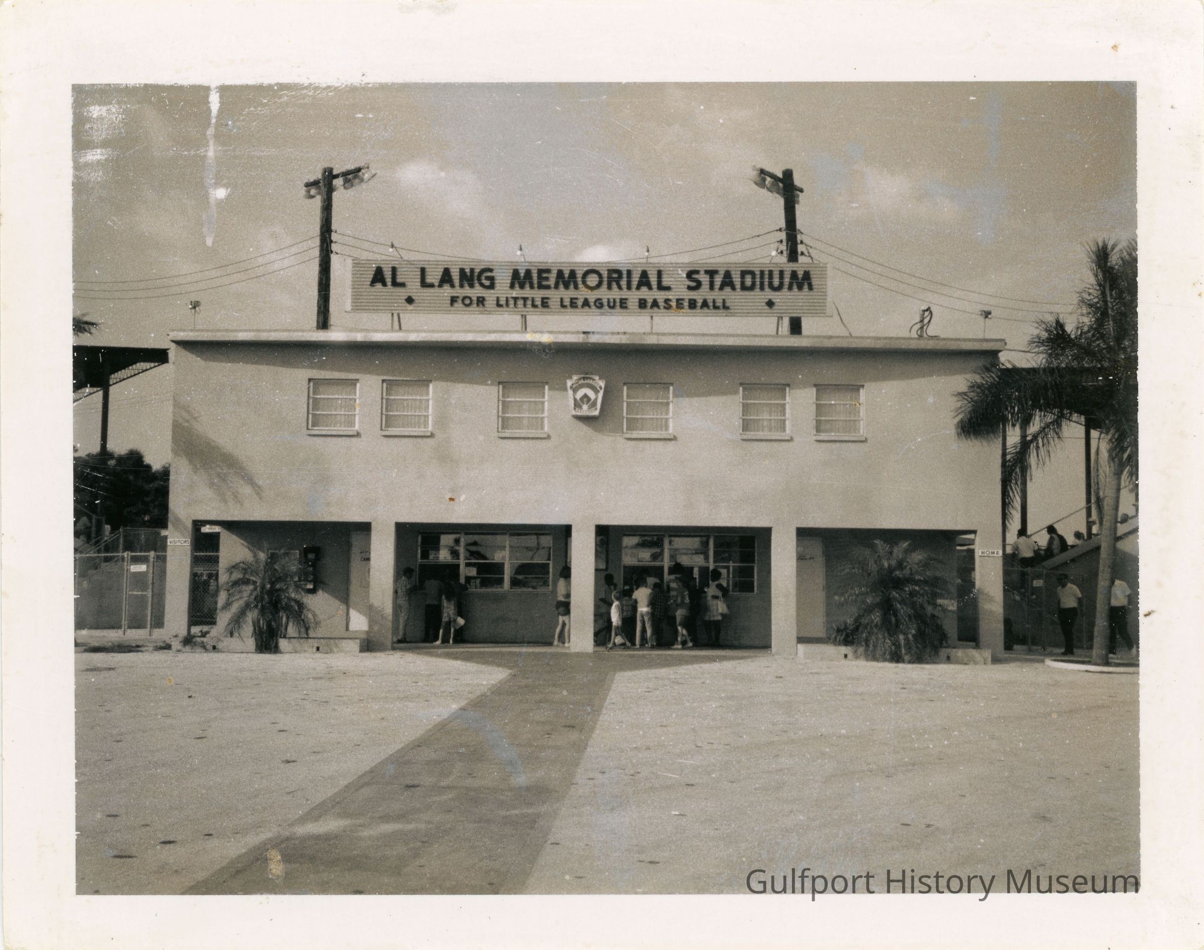 A black and white photograph of the front of Al Lang Memorial Stadium for Little League Baseball at the Southern Regional Headquarters and Training Center, which was located at 658 58th St S.