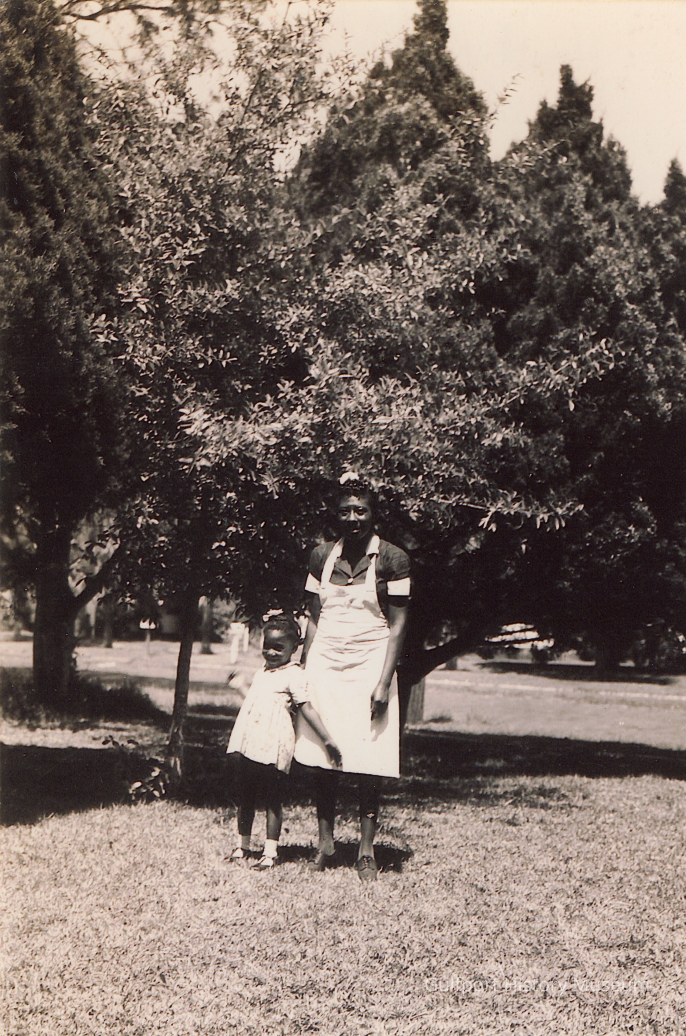 A black and white photographic print of the head cook of the Cedars of Lebanon Hospital, Alice, and her daughter standing on the side lawn of the Cedars. She is wearing her uniform dress and an apron. Her daughter is dressed in a dress, white ankle socks, and dress shoes.