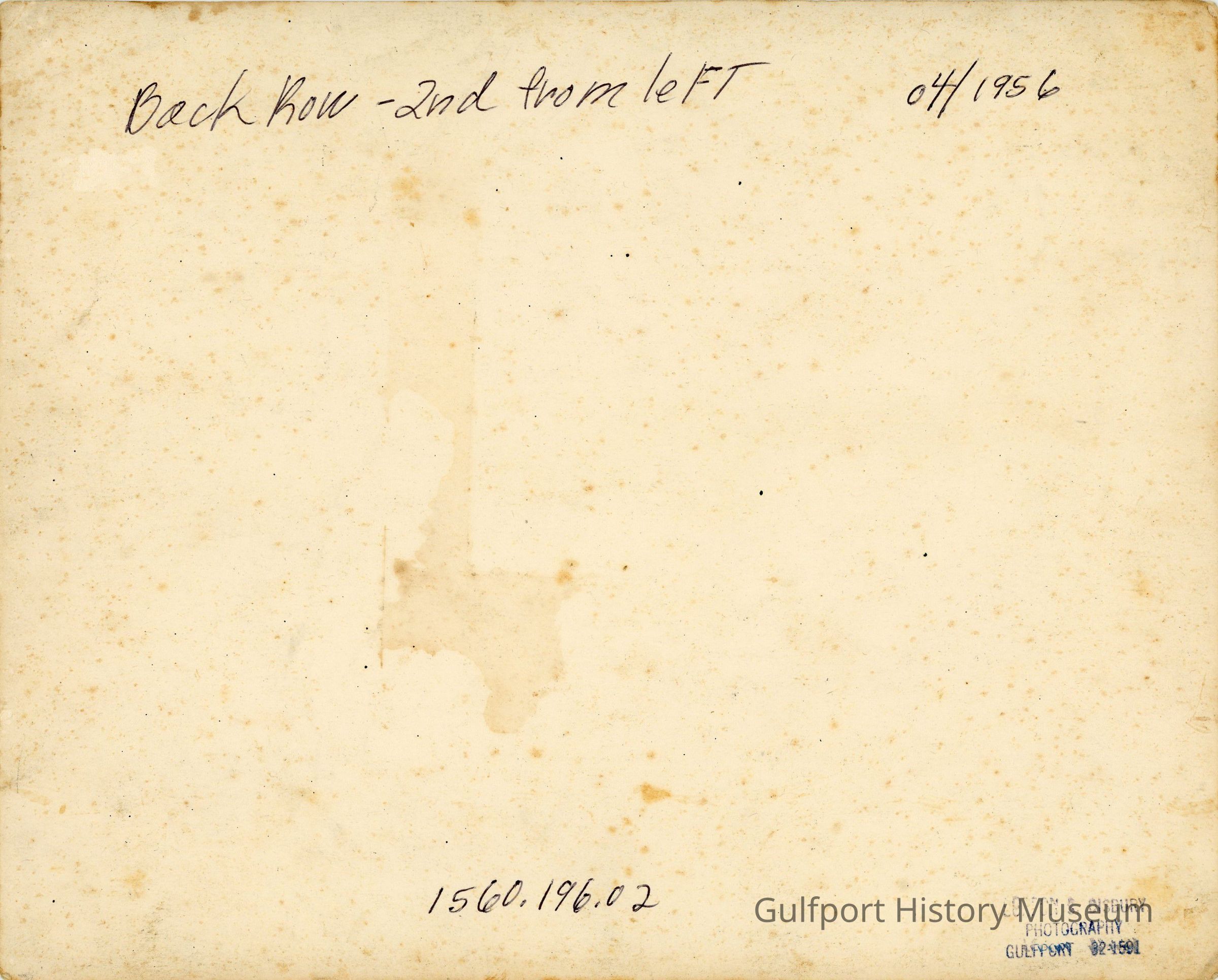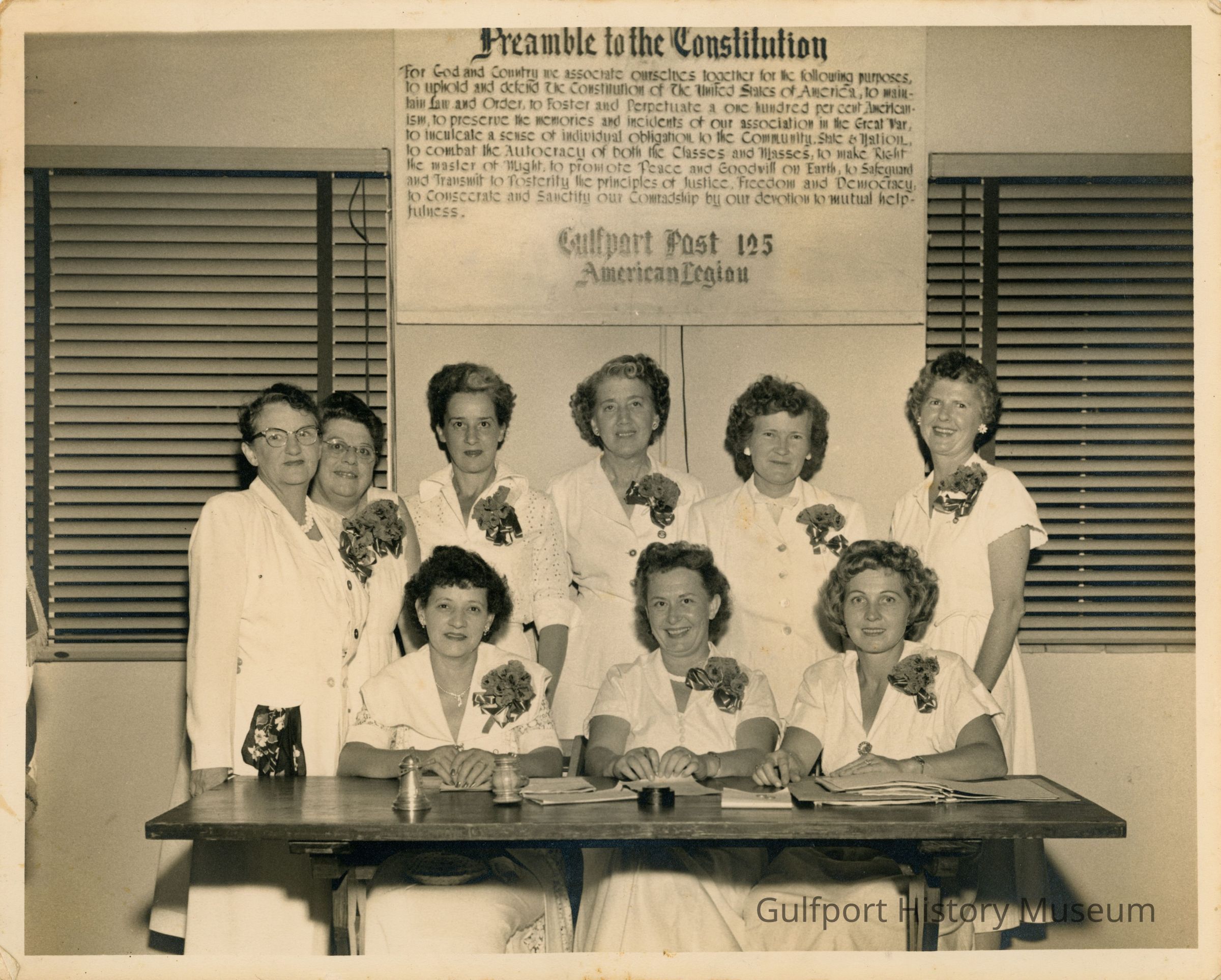 A black and white photograph of the members of the Gulfport American Legion Auxiliary. The women are wearing large flowers pinned to their white dresses. They sit and stand behind a table. The Gulfport Post 125 American Legion sign is hung behind them with the Preamble to the Constitution.