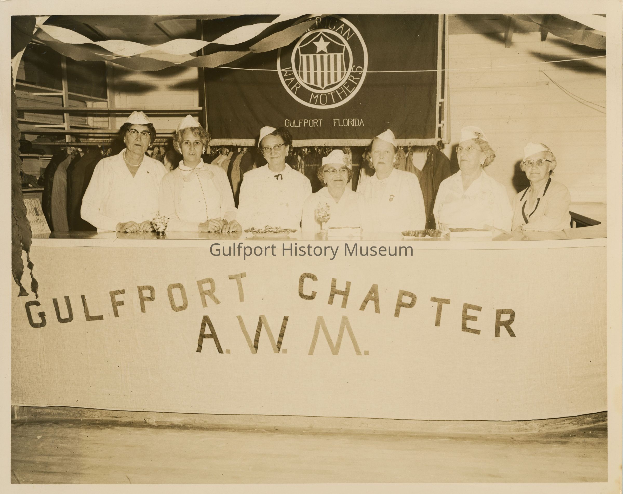 A black and white photograph of seven members of the Gulfport Chapter of American War Mothers standing behind a counter [at the Gulfport Casino?] which reads "GULFPORT CHAPTER A.W.M." Behind them hangs an American War Mothers flag, as well as a full coat rack. Streamers are slightly visible hanging from the ceiling.