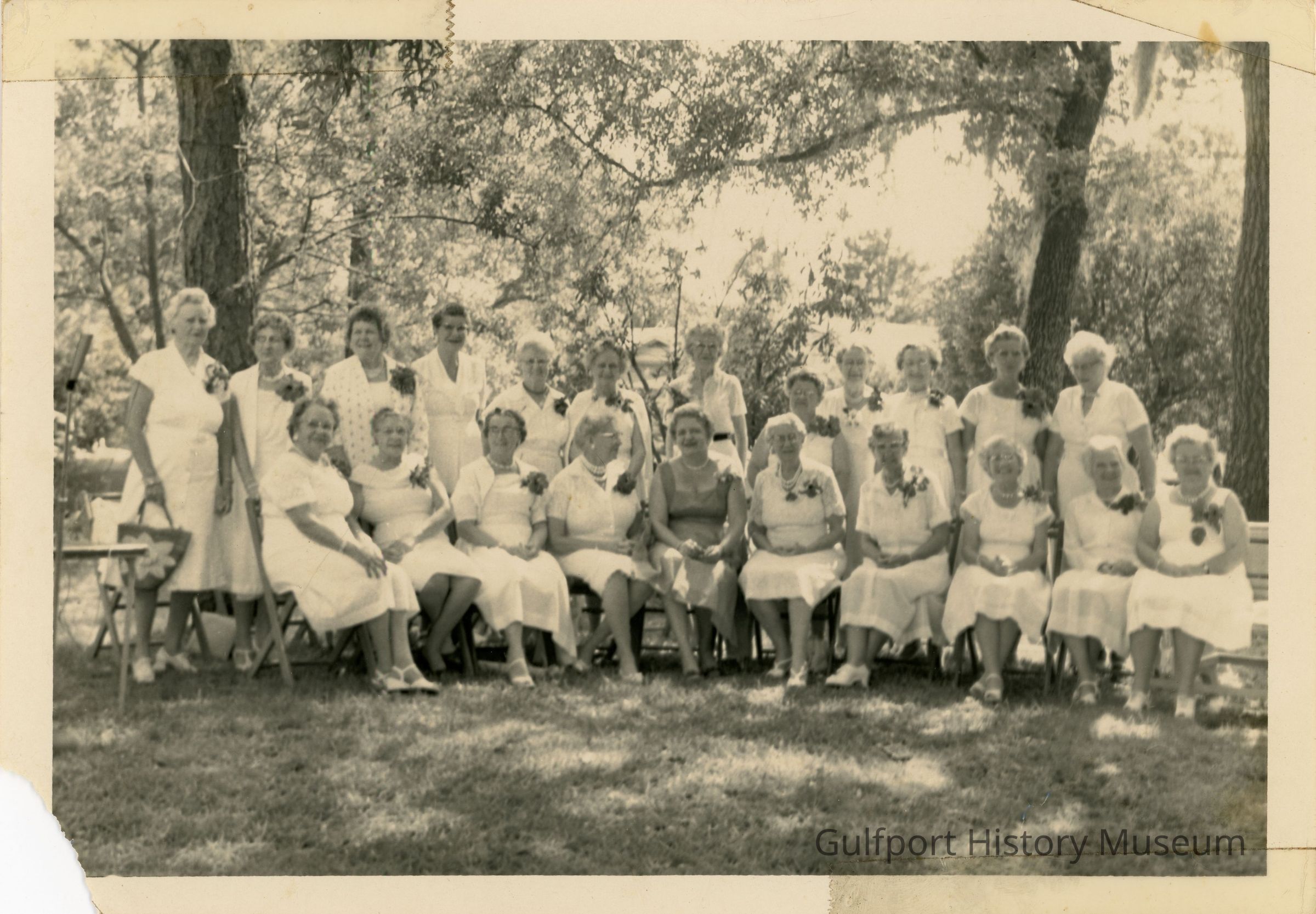 A black and white photograph of the Gulfport American War Mothers in a park. All of the members are wearing white dresses, with the exception of the woman sitting at the center.