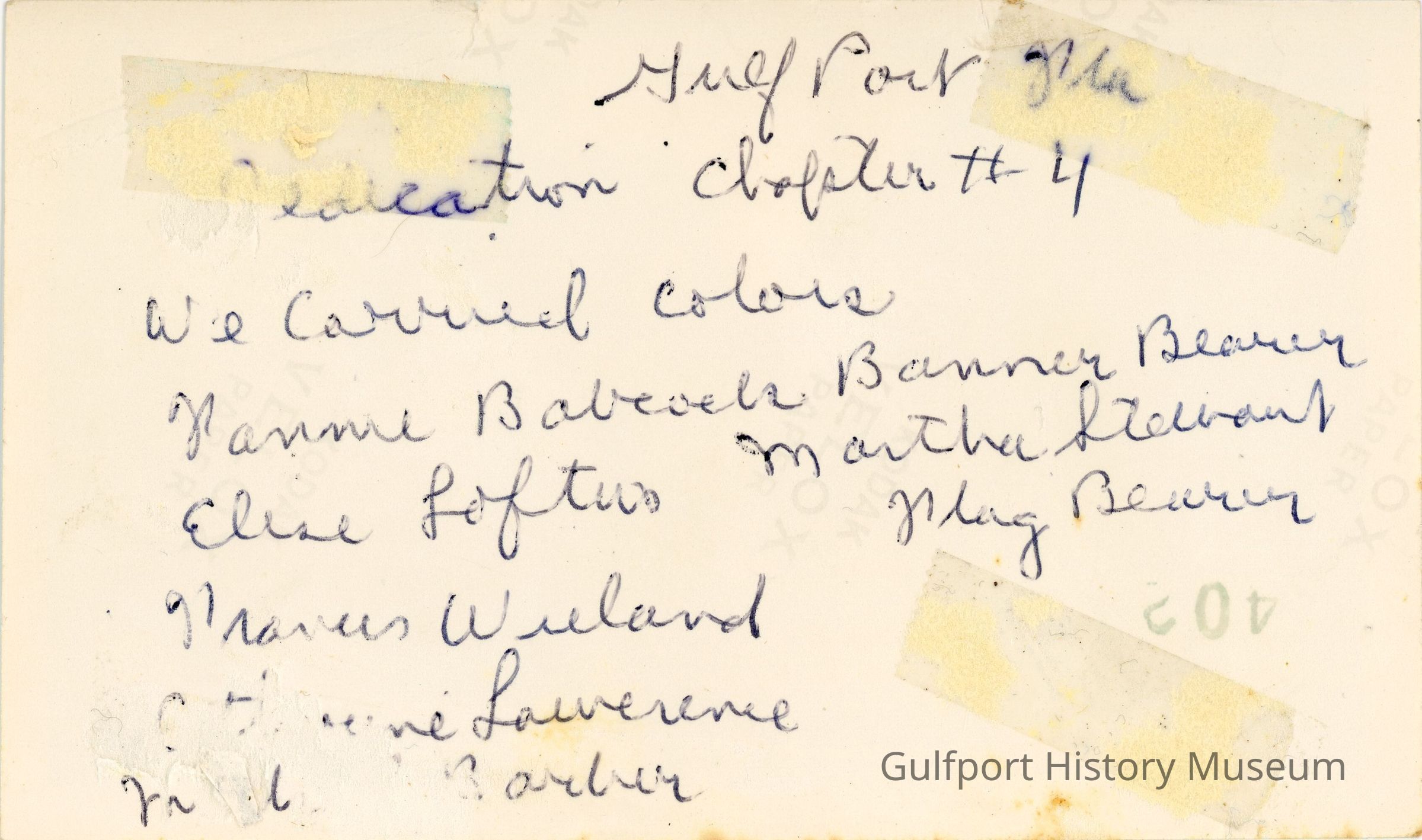 Gulfport Fla / Recreation chapter #4 / We carried colors / Fannie [?] Banner Bearer / Elize Loftus[?] Martha Stewart Flag Bearer / [?] Wieland[?] / [?]ne Lawerence (?) / [?] Barber