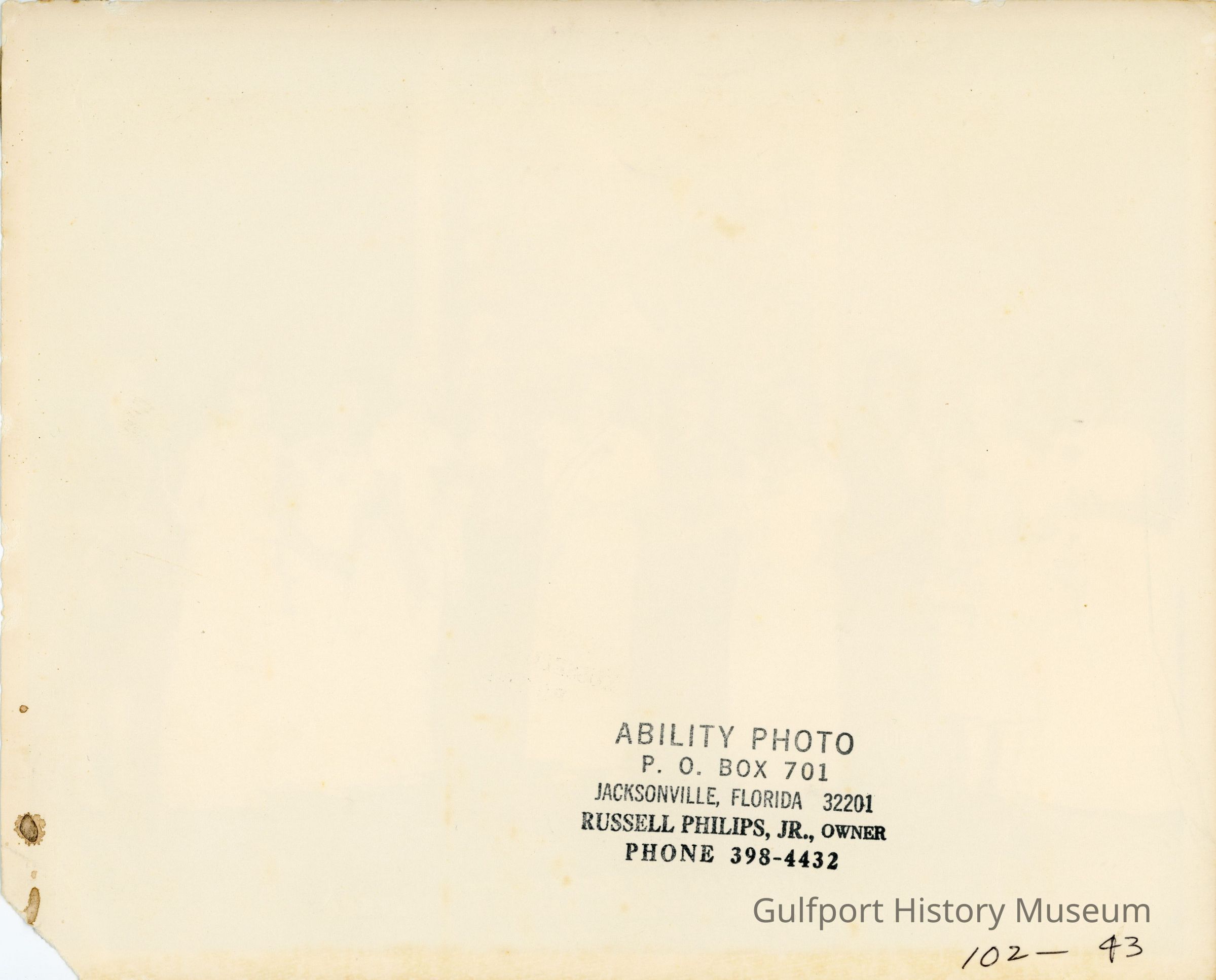 A black and white photograph of eleven women of American War Mothers at the 34th Annual State Convention. They stand in a line wearing dresses and holding roses. The woman at the center wears a sash.