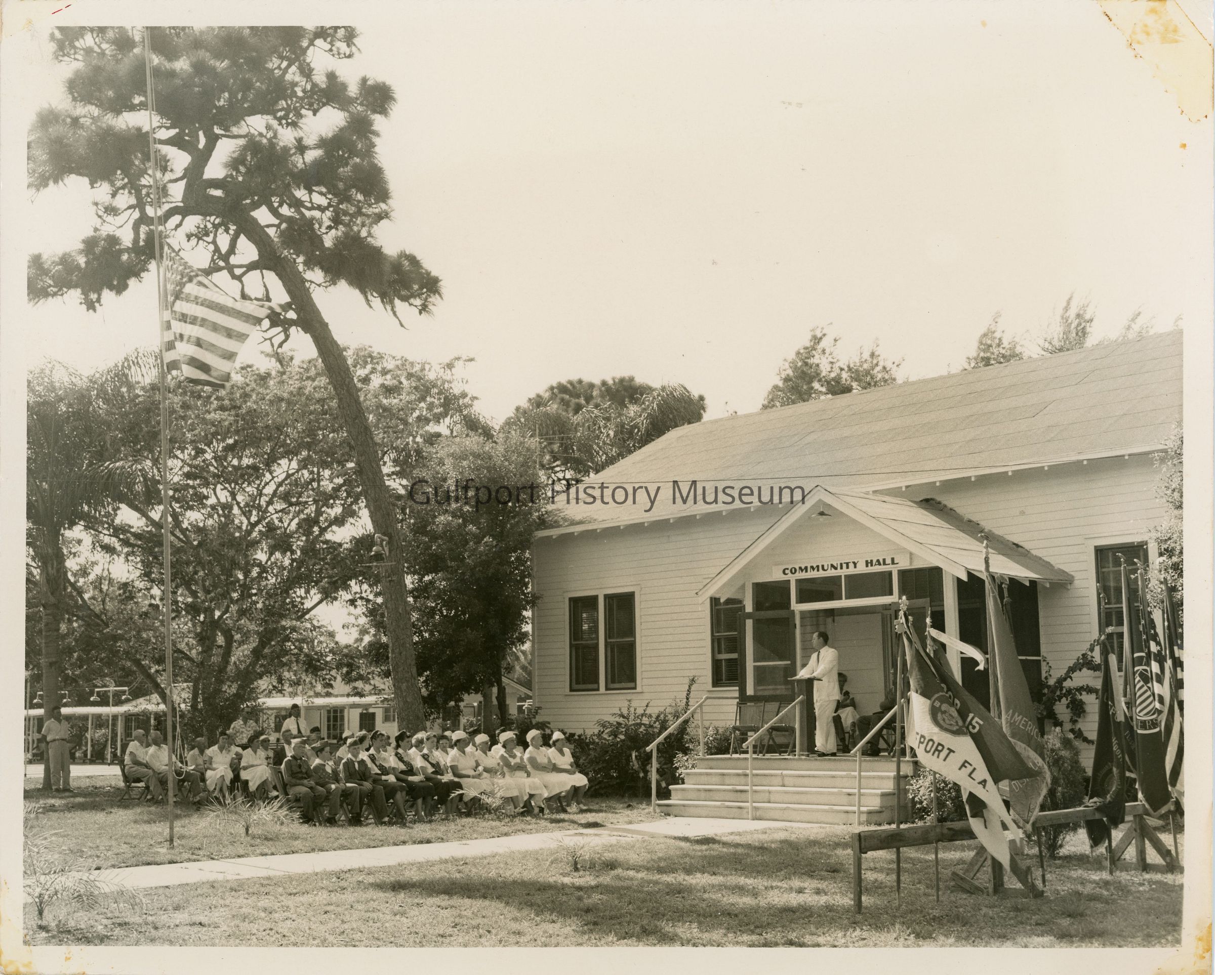 Community centers, Architecture, Fashion--1950-1960, Uniforms, Flags, DedicationsSubject Person or Organization