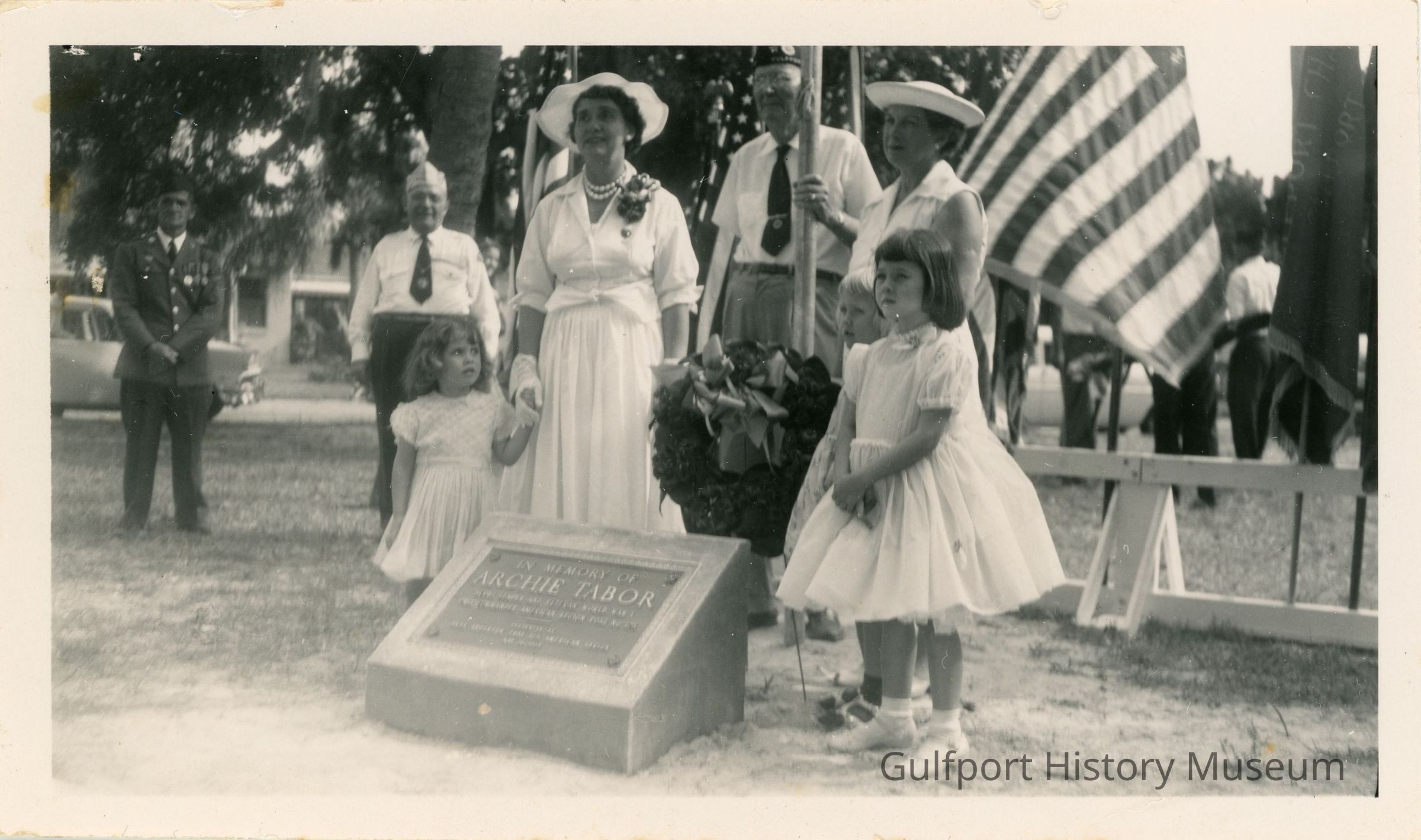 A black and white photograph of the family of Archie Tabor standing behind his memorial in front of Community Hall (Scout Hall) during the dedication ceremony.