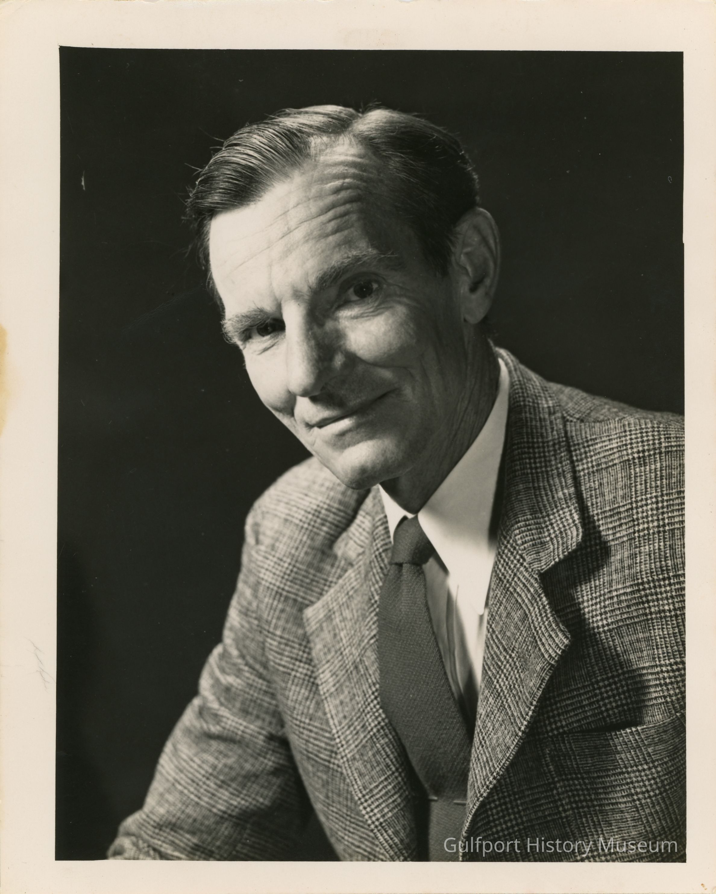 A black and white photograph portrait of [Austin M. (Speed) Huff]. He wears a tweed jacket and tie and has neatly combed hair.