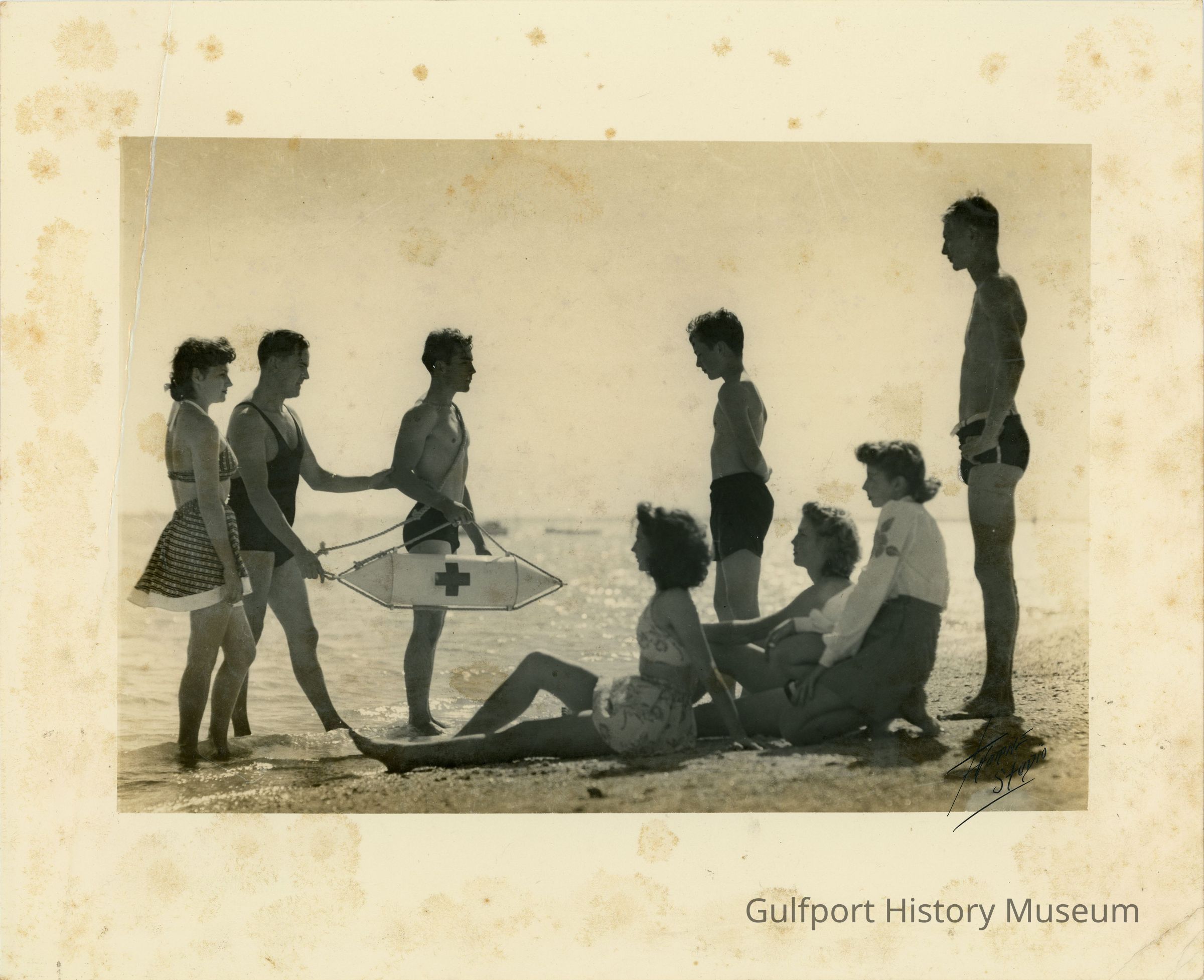 A life-saving class organized by the Red Cross and the YMCA in 1943. Julia Jean Gray, Instructor Bob Zubrod, Don Fitzpatrick, Anna Marie Gaskins, James Stambaugh, Anna White, Glennis Schultz, and Allen Miller. NOT THIS ORDER #127Language
