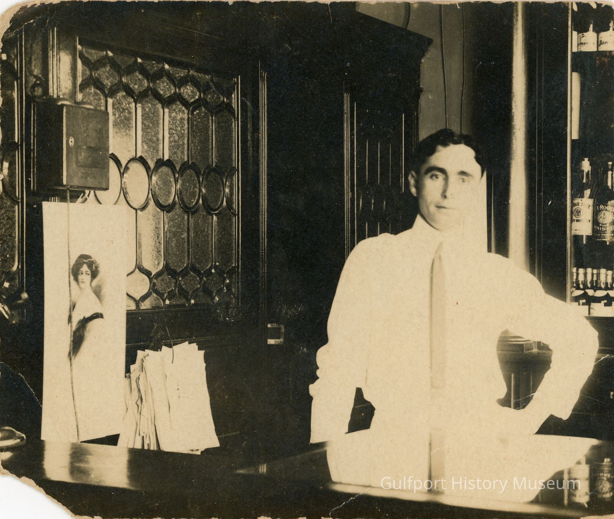 A black and white photographic postcard of John W. Potts standing behind a bar. He is wearing white, a collared shirt and tie. A medium-sized painting of a woman can be seen to the left. Shelves full of bottles are behind him.Subject